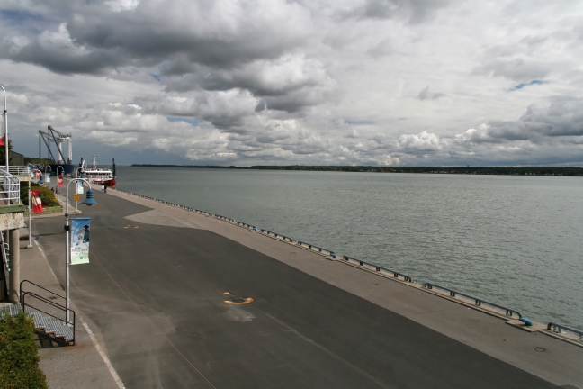 Die seitenverkehrte Darstellung des nordamerikanischen Kontinent habe ich erst zuhause festgestellt  :oops:. Sie ist beabsichtigt, damit durch die Sonne (wenn sie denn jemals scheint) das richtige Bild auf den Boden geworfen wird. Direkt neben dem Bahnhof liegt der Vieux Marché mit üppigem Obst- und Gemüseangebot. Wir kaufen einen Cranberrytee. Zum Fährhafen nutzen wir den Ecolobus – kleine Elektrobusse für 1 CAD pro Fahrt. Wir kommen gerade recht, um um 16:00 mit der Fähre nach Levis zu fahren. Vom Boot aus hat man einen schönen Blick auf die Altstadt mit Chateau Frontenac – allerdings alles im Gegenlicht.