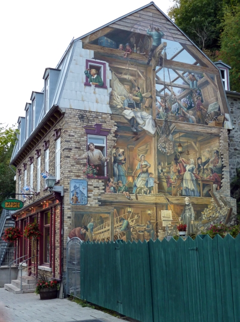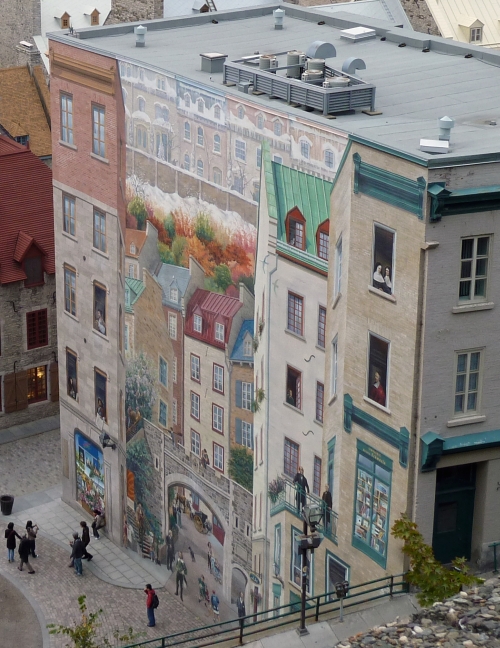 Schließlich wechseln wir über eine Treppe in die Ville Basse, die etwas stärker touristifiziert ist. Dort ergattern wir im Petit Champlain eine hübsch bemalte Teekiste sowie ein ebensolches kleines Tablett aus Holz. Besonders bemerkenswert sind an zwei Hausfassaden in der Ville Basse große Murals in Trompe l'Oeuil-Technik mit wuselnden Szenen aus dem historischen Alltag.