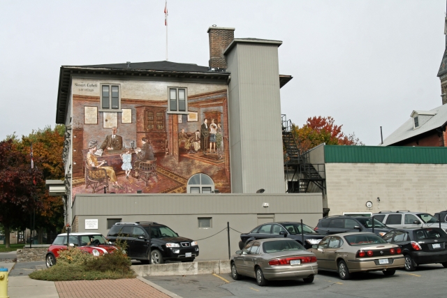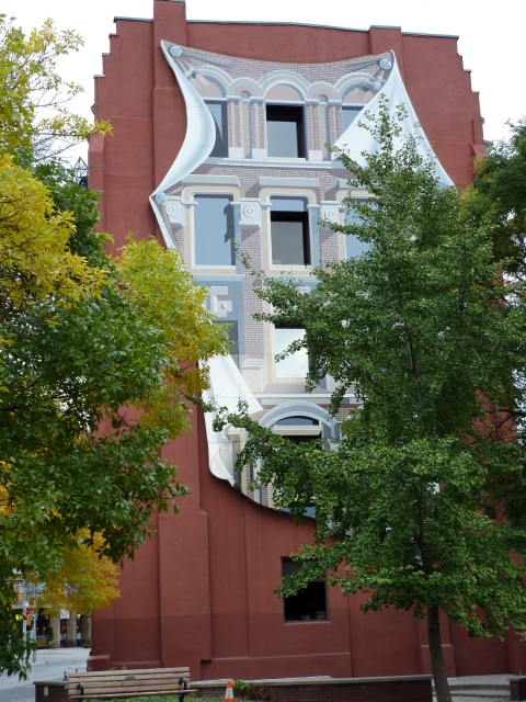 Im Zickzack gehen wir zurück zum Hotel, wo wir noch Zeit haben, einen Tee zu kochen und unsere Bananen sowie das letzte Muffin von Niagara on the Lake als Mittagssnack zu essen. Unterwegs treffen wir auf die Vorderseite des Flatiron Building an der Front Street, dessen Rückseite das gestern abgebildete Trompe l'Oeil ziert.