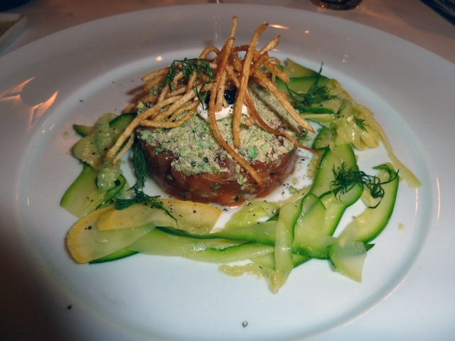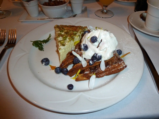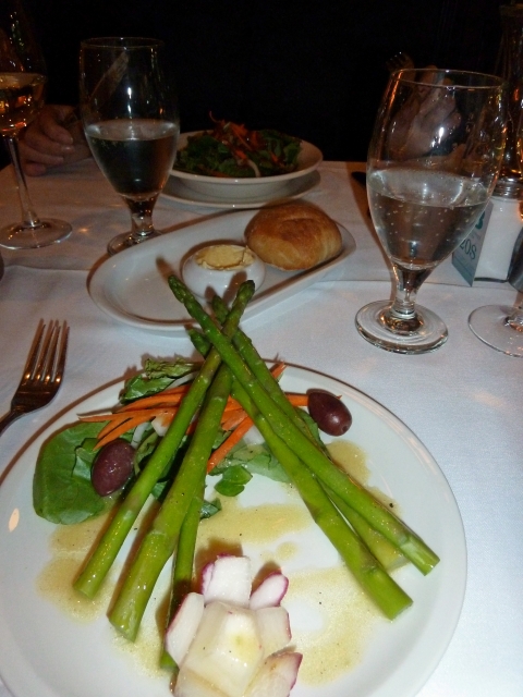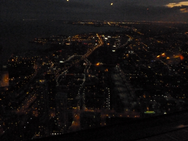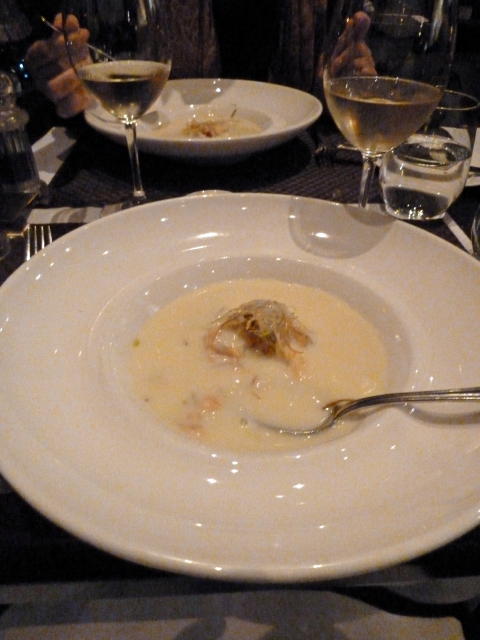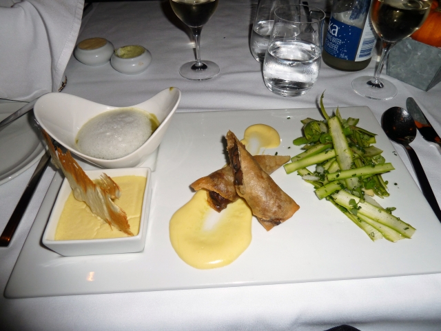 Wir bekommen eine Kürbissuppe und Jakobsmuscheln – fünf Stück an der Zahl mit feinen Bohnen, Blumenkohl und Reis. Dazu trinken wir einen Chardonnay aus Südafrika (kanadische Weine sind offen sehr selten zu bekommen und eine ganze Flasche ist uns zuviel) und zur Abwechslung mal wieder ein anderes Mineralwasser: Gerolsteiner.