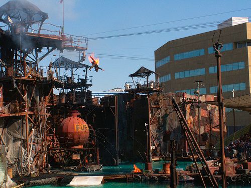Die nächste Attraktion erwartete uns mit "Back To The Future". Diese Simulationen gibt es in allen Parks, nur unter anderen Titeln. Es macht jedoch jedes Mal aufs Neue Spaß. Nur Tina war danach etwas angespannt und brauchte erst mal eine kleine Trink- und Verschnaufpause. Daraufhin ging es auch ruhig weiter mit Animal Planet Live. Hierbei handelt es sich um eine kleine Tiershow, in erster Linie für Kinder. Ist zwar ganz nett, man muss es aber nicht gesehen haben. Danach begann eine Vorstellung von Waterworld. Diese Stunt-Show wollte ich mir nicht entgehen lassen. Und ich muss sagen, es hat sich gelohnt. Diese Show bietet neben den üblichen Stunts auch eine Reihe toller Überraschungseffekte. In den vorderen Reihen sollte man sich darauf vorbereiten nass zu werden.