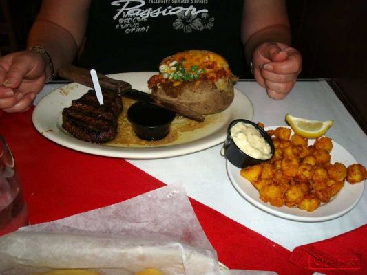 Das Essen war super, mein Mann wählte Rib Eye Steak blackened (16oz) für $26,99 und ich nahm New York Strip (6oz)+Scallops+Salat für $25,99 und dazu eine Loaded Potato (war gefüllt mit Bacon+Cheese+Sour Cream, $2,50).