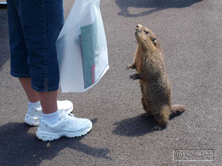 Jaja, das Murmeltier hat wirklich gebettelt. Der Mann mit der Tüte hat extra Chips gekauft und dem Tierchen was abgegeben. Meiner Meinung nach die falsche Ernährung...