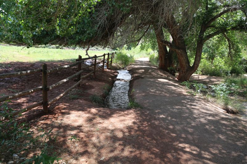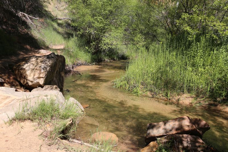Der Weg liegt auch jetzt am Vormittag bereits meist in der Sonne und hat nur im letzten Drittel kurze schattige Passagen unter den Sträuchern entlang des sanft fließenden Creeks. Die Strecke weist keine gröberen Anstiege auf und hat hin und zurück eine Länge von gut 8,5 Kilometern - reine Gehzeit ca. 2,5 bis 3 Stunden. Mit ausreichend Wasservorrat würden wir sie als moderat einstufen.