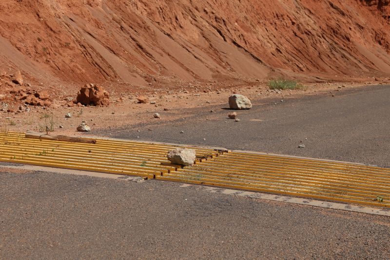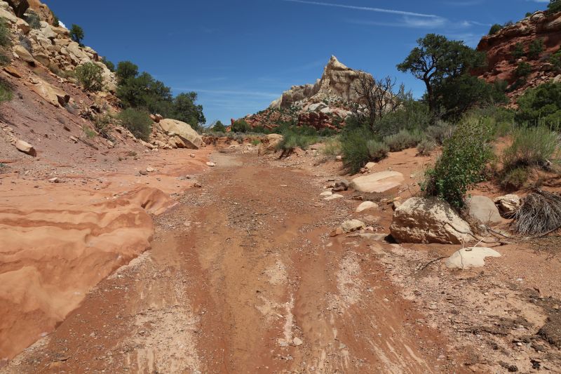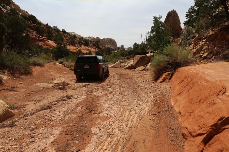 Bis auf die Brücke und dortigen Ausblick nicht unbedingt den Abstecher Wert - aber das ist unsere subjektive Meinung, es gibt sicherlich auch Leute denen es gefällt, somit sollte man's selber ausprobieren und sich seine Meinung machen. Wir fahren die Schleife dann fertig bis Escalante. Wie das Amen im Gebet erwischt uns dann auf den letzten Meilen der tägliche Gewitterschauer. Die Kombi aus Staub, Regen und wieder Staub bzw. Schlamm macht unseren Tahoe zum "Schwein in der Suhle".