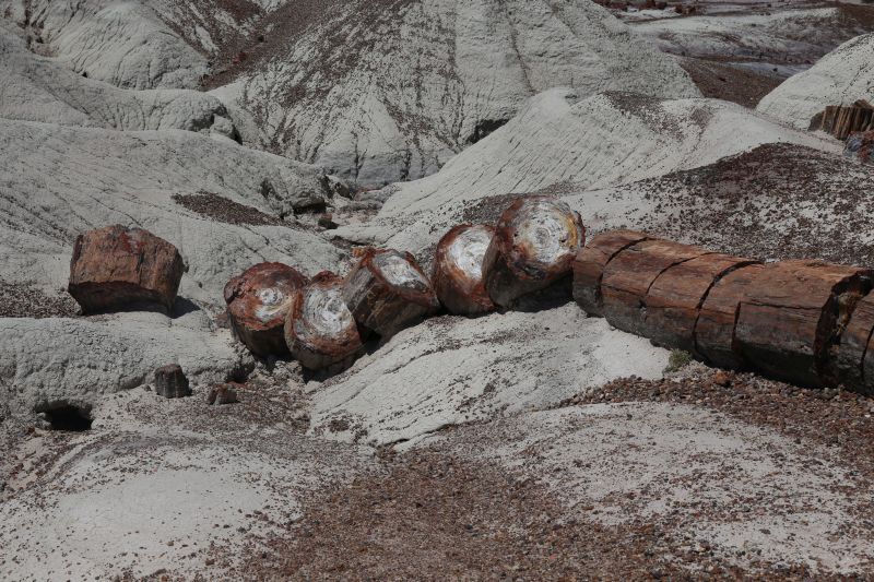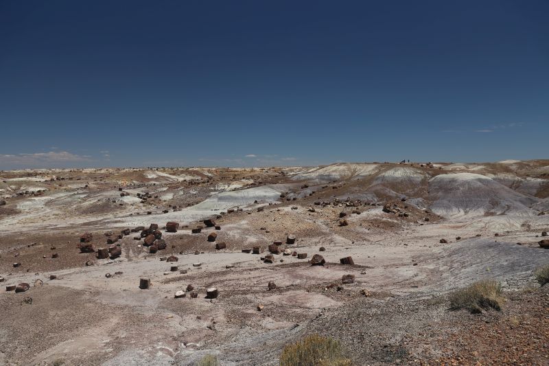Mich begeistern nicht nur die versteinerten Baumreste, sondern die trotz der Kargheit fesselnde Landschaft mit ihrem Farbenspiel. Es ist schweineheiß um die Mittagszeit und so halten wir nicht bei jedem Viewpoint, genießen aber dennoch diese wunderschöne Ecke der USA.