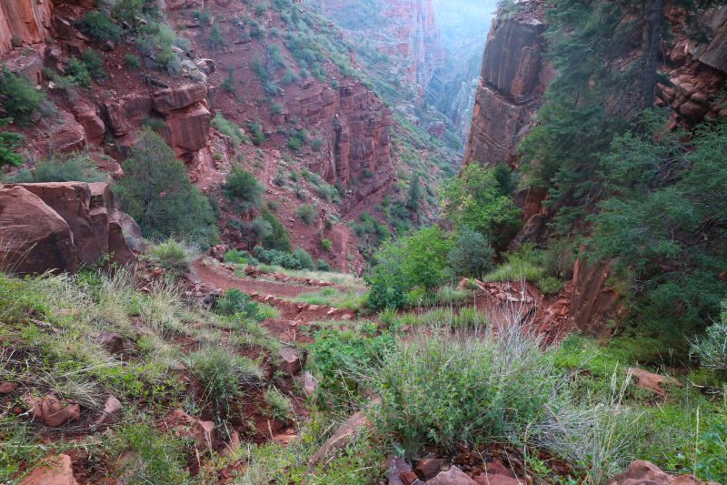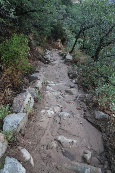 Der Trail geht im ersten Drittel steil hinunter in den Roaring Springs Canyon - vom Start auf 2.512 m Seehöhe bis zum Pumphouse knapp unterhalb von Roaring Springs sind es 1.110 Höhenmeter und das auf einer Distanz von 8,4 Kilometern - dies entspricht einem durchschnittlichen Gefälle von 13 %. Die Entscheidung für die Trekkingstöcke war somit goldrichtig, insbesondere bei den stark wechselnden Bodenverhältnissen und meinem Kampfgewicht von 115 kg