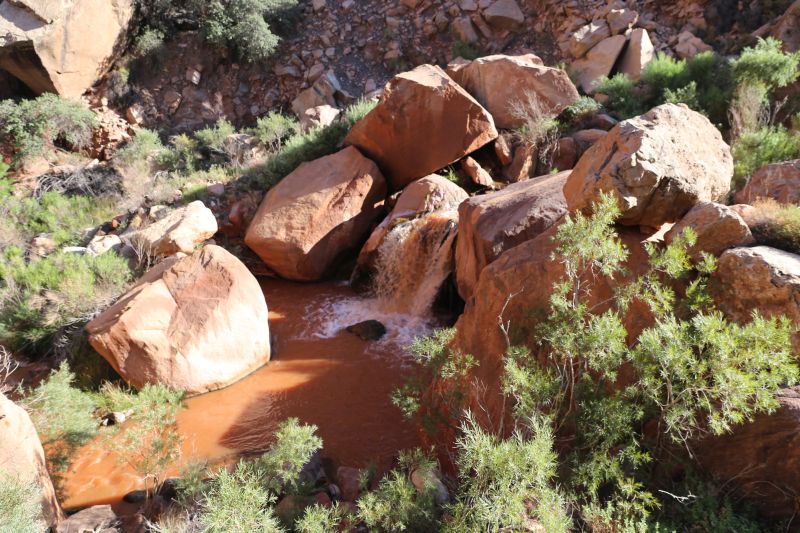 Nix mit Backofen und Gluthitze, da man in der Box immer wieder von einer auf die andere Seite des Creeks wechselt, geht man abwechselnd in der Sonne und im Schatten. Ich muss aber gestehen, dass ich Glück hatte in der Regel ist es um diese Jahreszeit mindestens 5 Grad wärmer und das kann zwischen diesen dunkelroten bis schwarzen Granitwänden wirklich heiß werden.
