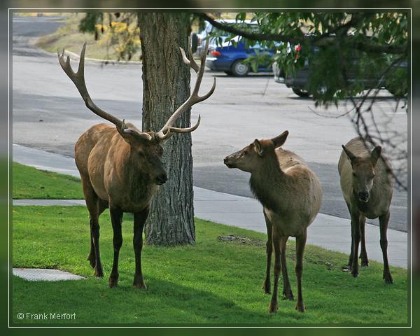 In Mammoth Hot Springs befindet sich das Hauptquartier des Nationalparks. Des Weiteren gibt es hier auch ein Visitor Center, vor dem wir unser Auto parkten. Das stellte sich aber im Nachhinein als Fehler heraus, denn das Visitor Center wurde von Wapiti-Hirschen umlagert. Die Ranger waren sehr darum besorgt, dass die Besucher den Tieren nicht zu nahe kamen (aus nachvollziehbaren Gründen, denn so ganz ungefährlich sind diese nicht). Dann tauchte auch noch ein Bulle auf, dem ich wirklich nicht in die Quere kommen möchte.