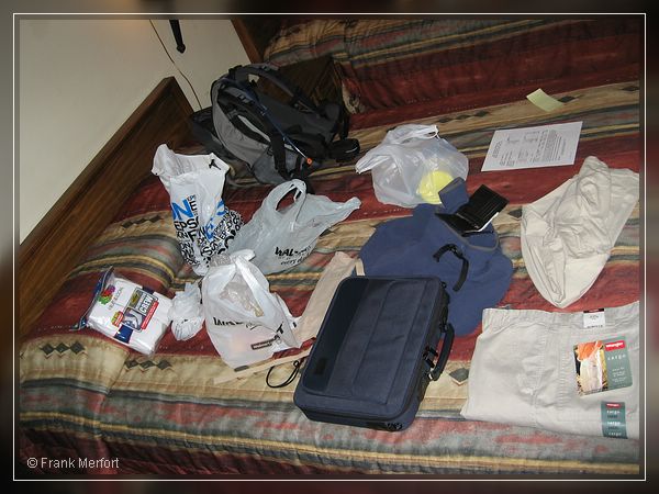 So ähnlich sah es dort eigentlich fast immer aus, nachdem wir ein Zimmer bezogen hatten :) Aber ich hatte nicht alles heute eingekauft, was da in Tüten zu sehen ist. Es ist vielmehr so, dass ich während der Reise meinen Krempel in Tüten sortiert habe, z.B. alle Kabel und Ladegeräte in eine Tüte, dreckige Wäsche in eine andere usw.