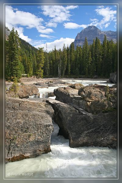 Es ging weiter durch den Nationalpark und gegen 12 Uhr erreichten wir die Stichstraße zur Natural Bridge (und dem Emerald Lake), also einem Felsen (genauer gesagt eine Kalksandsteinschicht), der durch einen Fluss (in diesem Fall wieder der Kicking Horse River) ausgehöhlt wird, so dass sich eine Brücke bildet. Der Parkplatz befindet sich praktisch direkt neben der Bridge. Dementsprechend war hier auch einiges mehr los.