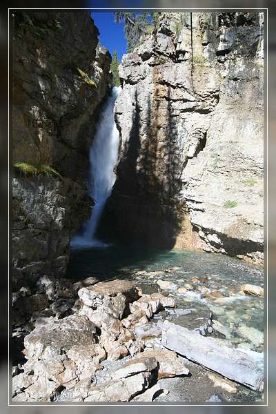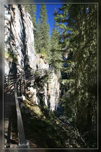 Um kurz vor 11 Uhr erreichten wir den Johnston Canyon. Dort führt ein Wanderweg in den Canyon hinein. Das schauten wir uns natürlich näher an. Es geht dabei teilweise über Metallstege immer weiter in die Schlucht hinein, während der Fluss unter bzw. neben einem entlang läuft. Ich fand das ganz klasse. Der Weg war aber sehr einfach zu gehen, es geht nur langsam bergauf.