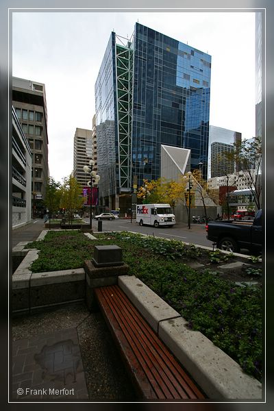Unterwegs hörte es irgendwann zum Glück auf zu regnen. In Calgary, wo wir gegen 10:30 Uhr ankamen, war es aber weiterhin stark bewölkt und ziemlich kühl. Wir wollten uns nun ein bisschen in Calgary umschauen. Dazu mussten wir zunächst mal einen Parkplatz finden. Wir fanden auch einen aber die Parkgebühren waren allerdings ganz schön happig, $6 pro Stunde :shock: Ist ja schlimmer als in Deutschland :) Der Parkplatz war auch ziemlich eng, nicht das was man sonst so im autofreundlichen Nordamerika vorfindet, aber gut, in einer Großstadt darf man da wohl auch nichts anderes erwarten. Auf jeden Fall lösten wir ein Ticket für 2 Stunden und machten uns zu Fuß auf durch Calgary.