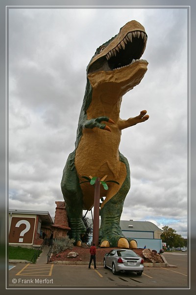 Drumheller ist eine kleine Stadt nordöstlich von Calgary und liegt am Red Deer River. Bekannt ist die Stadt für die hier in der Nähe gefundenen Dinosaurierfossilien. Eine der Sehenswürdigkeiten in Drumheller ist daher auch dieser riesige Dinosaurier mit dem Namen „World's Largest Dinosaur“, ein Tyrannosaurus Rex mit einer Höhe von 25m, also doppelt so groß wie die vor Urzeiten tatsächlich mal gewesen waren.