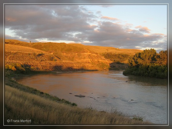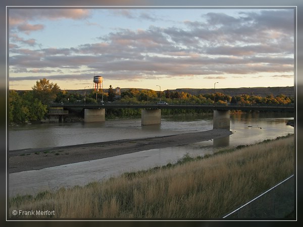 Bei Sonnenschein sieht das alles bestimmt viel schöner aus. Die gesamte Fahrt über den South und North Dinosaur Trail hatte gute 1 ½ Stunden gedauert. Als wir wieder in Drumheller waren, ging es nun noch zum Lebensmittel einkaufen und tanken. Hier in Drumheller gab es übrigens den bisher günstigsten Sprit in Kanada, $1,019 pro Liter. Anschließend fuhren wir zurück zu unserem Motel. Dort machte ich auch noch ein paar Fotos, u.a. vom Red Deer River.