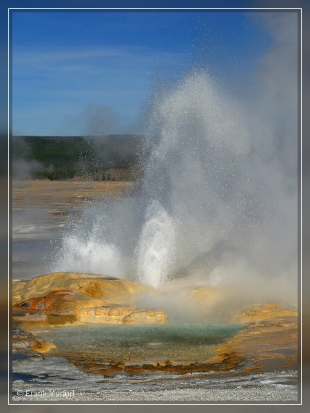 An dieser Nebenstrecke befindet sich auch der Great Fountain Geyser. Auf einem Schild stand, wann dieser das nächste Mal voraussichtlich ausbrechen würde und oh Wunder, ein Ausbruch stand unmittelbar bevor. Dieser wurde auch dadurch angekündigt, dass Wasser über die Terrassen läuft. Auch das war schon der Fall.