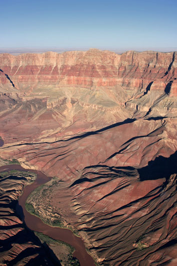 Okay, so schlecht ist die Mitte dann doch nicht. Von links scheint während des ersten Teils der Tour die tiefstehende Sonne in den Hubschrauber, da wäre es mit Fotos sowieso nichts gewesen. Und der nette Fluggast auf meiner rechten Seite ist von meinen schwarzen Blicken beim Einsteigen offenbar so tief beeindruckt, dass er sich jedesmal zusammenkauert, wenn ich die Kamera hebe. Unser Flugcaptain erfreut uns mit Klängen aus „2001 - Odyssee im Weltall", und ich hoffe, dass das Schicksal für heute nicht die Fortsetzung „2007 - Odyssee im Canyon" vorgesehen hat. Aber nein, der Captain beherrscht seinen Job und fliegt souverän die große Runde am East Rim vorbei, dann hinüber zum North Rim und schließlich wieder quer über den Canyon zurück nach Süden. Ein wenig näher als heute vormittag kommen wir dem Colorado dabei, aber weil der Hubschrauber nicht in den Canyon hineinfliegen darf, kann man die tatsächliche Tiefe nur erahnen.