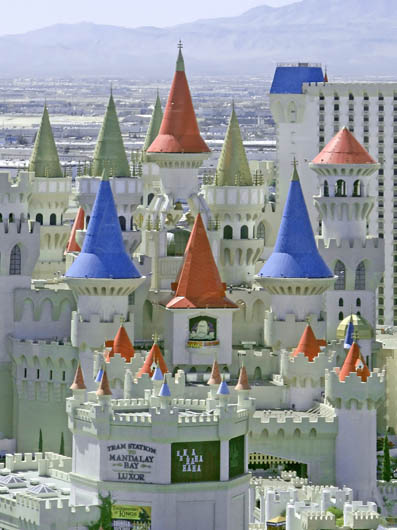 Vom Hooverdamm aus ist es dann auch nicht mehr weit bis Las Vegas, wo wir bei Einbruch der Dunkelheit eintreffen. Dank der guten Ratschläge aus dem Forum haben wir uns zum Players-Club-Tarif im MGM Grand eingemietet. Das Einchecken verläuft völlig problemlos, wir bekommen ein Zimmer im 28. Stockwerk mit Blick aufs Excalibur. Was für ein Unterschied zu der Cabin am Grand Canyon! Ein Blick ins Marmorbad, einmal probeliegen auf den breiten Betten, das gönnen wir uns noch. Aber dann geht es auch schon zur Fotosafari auf den Strip. Ein bisschen kennen wir ihn ja schon, den Las Vegas Boulevard, aber nach über zwei Wochen in der Stille der Nationalparks kommt er einem fast noch überdrehter vor als am ersten Abend.