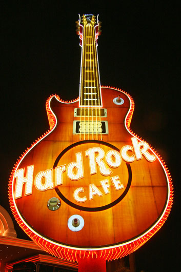 Übers Bellagio kommen wir nicht hinaus, denn jetzt meldet sich der Hunger. Das Hard Rock Café ist gar nicht weit von hier, zumindest lässt der Reiseführer das vermuten. Da könnten wir schnell zu Fuß hin. Wir laufen also los. Um irgendwann festzustellen, dass es doch ein bisschen weiter ist als eigentlich gedacht. Und dass die Gegend auch nicht mehr so gut aussieht wie eigentlich gedacht. Und dass das Hard Rock Café leider auch nicht geöffnet ist, wie eigentlich gedacht. Sondern von irgendeiner „Private Party" belegt wird. Um zu demonstrieren, dass das nicht bloß ein blöder Türsteherspruch ist, tummeln sich fröhliche Leute mit fröhlich sprudelndem Sekt im Eingang.