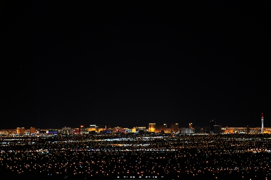 Um 19:00 Uhr setzen wir uns wieder ins Auto. Wir haben Vegas und die Hotels schon zu oft gesehen, um unbedingt den Strip hoch- und runter zu laufen oder in ein bestimmtes Hotel zu fahren. Einzig das Aria und das Palazzo sind vielleicht noch interessant. Heute steht aber ein anderes Projekt an, ein Foto der Skyline vom Temple Drive. Der erste Versuch 2007 ist kläglich gescheitert, diese Jahr soll es besser werden. Leider ist das vorgesehene Objektiv inzwischen Schrott, aber ich möchte es dennoch versuchen. Vorher erfolgt der letzte Besuch von Taco Bell in diesem Urlaub, sehr lecker. Warum gibt es den Laden immer noch nicht Deutschland? Dann fahren wir zum Temple Drive und suchen eine gute Lokation. Wir werden angesprochen, ob wir etwas suchen und erhalten den Tipp, ans Ende der Owens Ave zu fahren. Machen wir. Dort steht zwar ein Security Mensch und man darf nicht in die Wohnsiedlung am Ende, aber der Blick ist toll. Eigentlich ist auch das Parken an der Straße nach oben verboten, aber der Security Mensch gibt uns sein okay. Das ist das Ergebnis: