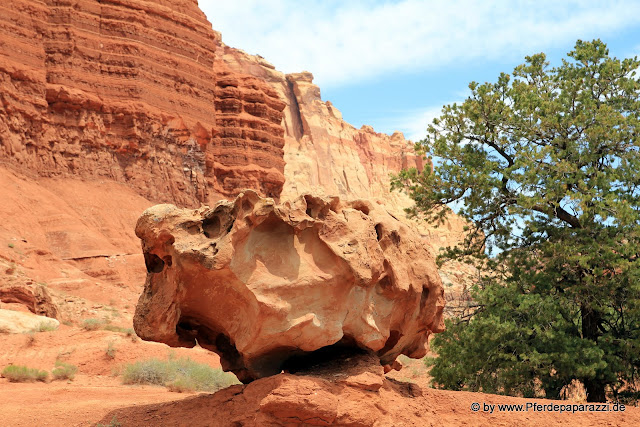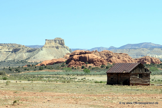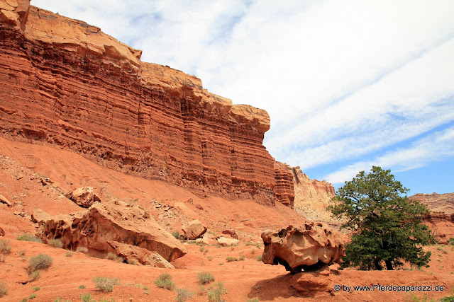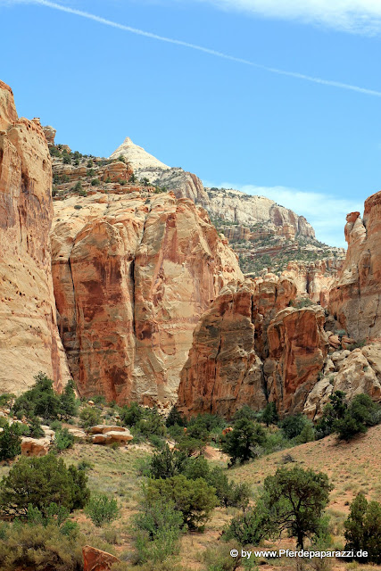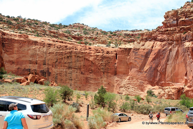 Kurz darauf folgte gleich der Capitol Reef National Park. Der heißt so, weil es dort einen Hügel gibt, dessen Dach die Form des Daches vom weißen Haus hat. Hier ist er im Hintergrund ein wenig zu erkennen. Das Ding mit der weißen Spitze was aussieht wie ne Schlumpfmütze.