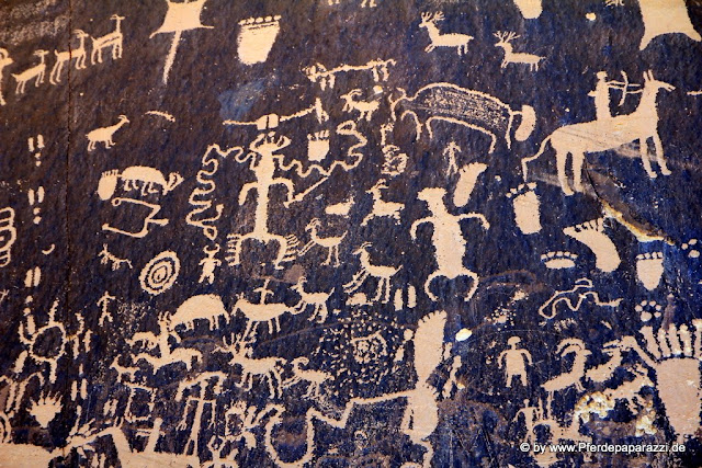 Auf der schon genannten Stichstraße in den Canyonlands National Park kommt man am Newspaper Rock vorbei. Hierbei handelt um Felszeichnungen die zum Teil über 2000 Jahre alt sind, andere wiederum sind neueren Datums nach dem Motto "XY was here"; Idioten gibts scheinbar überall, selbst an so abgelegenen Orten.