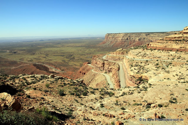 Der Weg dort hin sollte jedoch auch wieder dazu beitragen das dies ein nahezu perfekter Tag wurde. Denn statt einfach den direkten Weg über den Highway zu nehmen, bogen wir  irgendwann mal links ab auf den Moki Dugway. So sieht das ganze von oben aus. Das ist echt der Hammer hier, die bauen überall in die tollsten Landschaften Straßen. Fehlt nur noch ein Drive Inn ;-)