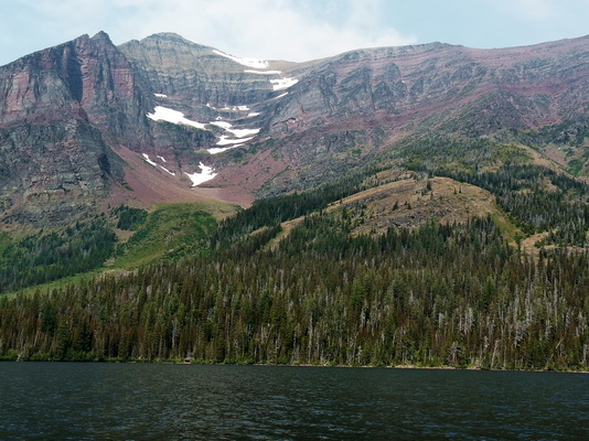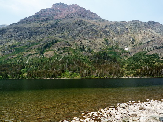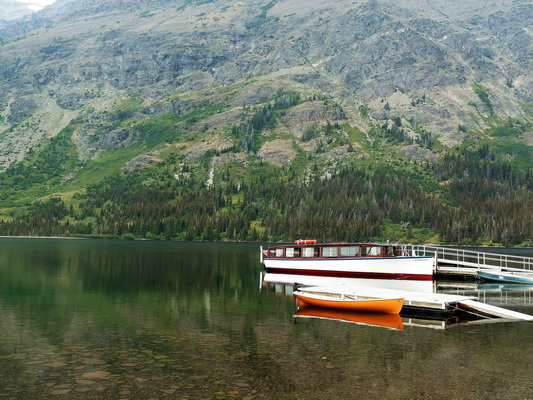 Weiter gehts zum Medicine Lake. Dort wollten wir zu den Twin Falls. Entweder man läuft 7,6 Meilen!!! von hier aus oder man nimmt ein Shuttleboot zur anderen Seite, dann sind es glaube ich nur 1,2 Meilen. Wir nehmen das Boot mit Hin und Rückfahrt für 12 Dollar. Wir haben noch ein wenig Zeit bis Abfahrt und laufen ein wenig herum. Bei bewölktem Himmel nicht so schön: