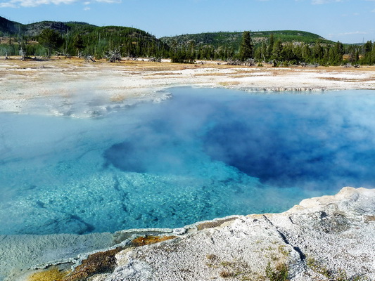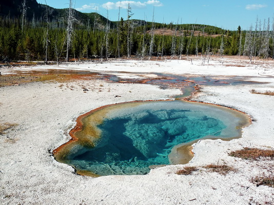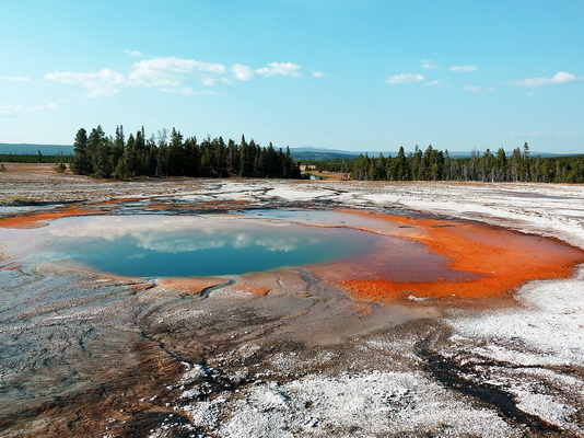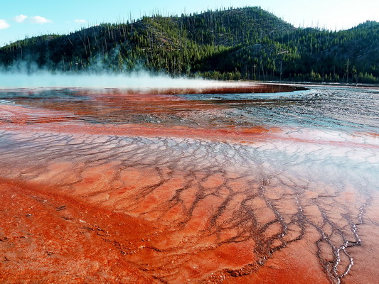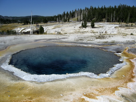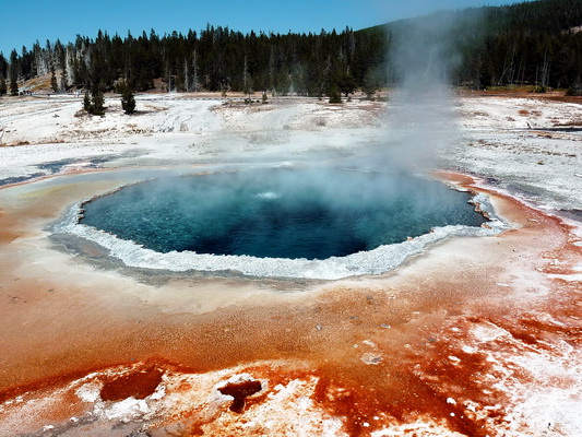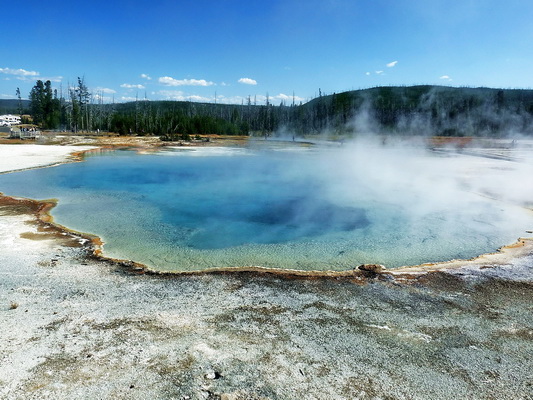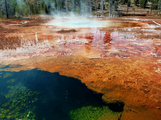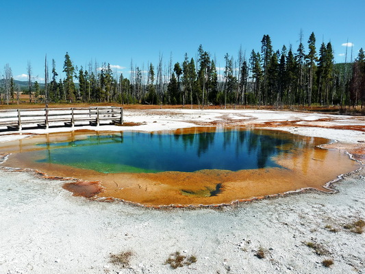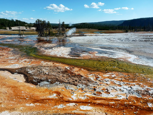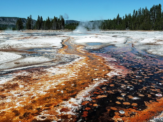 Wir fahren ein kurzes Stück zum Biscuit Basin. Gegenüber des Parkplatzes auf der anderen Strassenseite beginnt der Trail zum Morning Glory Pool. Obwohl wir ein bisschen kaputt sind und die Sonne weiter auf uns glühte laufen wir ca. 30 Minuten den Trail und sehen u.a. den