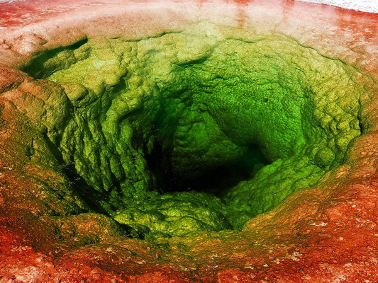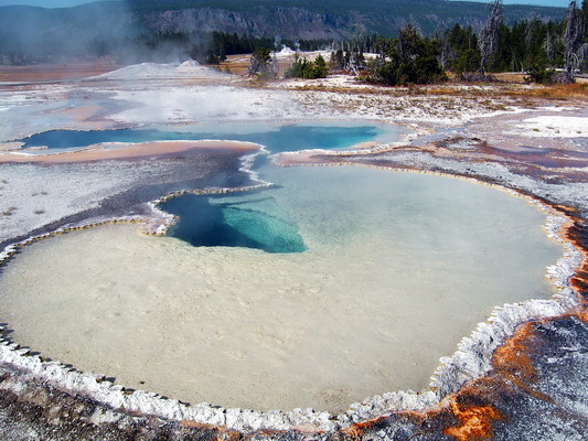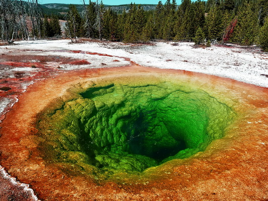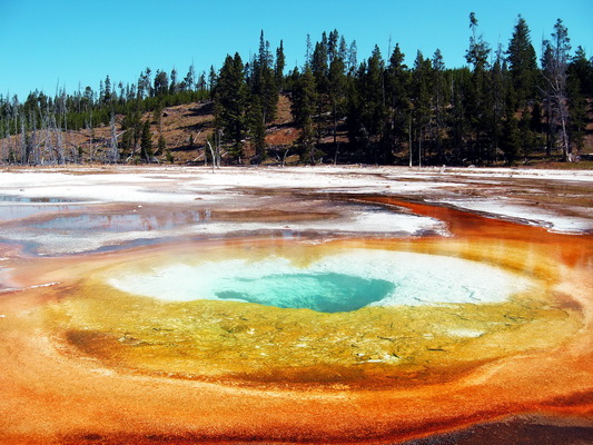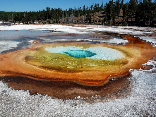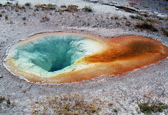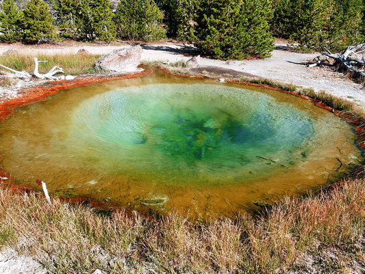 Ja und dann kommt der Oberhammer. Wir kommen zum Morning Glory Pool. Wie viele hier im Forum geschrieben haben, längst nicht mehr so farbenfroh wie früher. Irgendwelche Idioten werfen da Gegenstände wie z:B. Geldstücke rein. Das haben auch gerade 2 Franzosen gemacht, als wir ankamen. Erst wollte ich was sagen, habs aber doch nicht gemacht, leider.