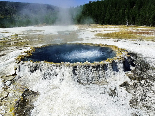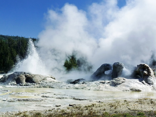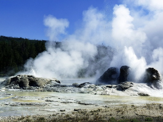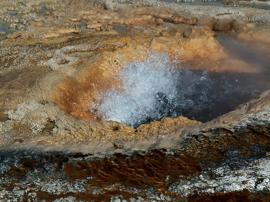 Dann laufen wir wieder zurück. Man kann auch vom Morning Glory Pool weiter laufen bis zum Biscuit Basin, das haben wir nicht gemacht. Wir erreichen den Daisy Geysir, aber auch hier ist der Ausbruch für uns unpassend. Nach dem Daisy Geysir führt ein kurzer Boardwalk zum Punch Bowl Spring. Auch hier scheint das Wasser zu kochen.