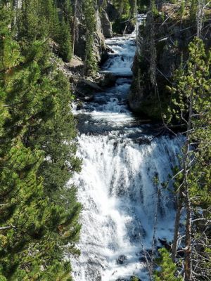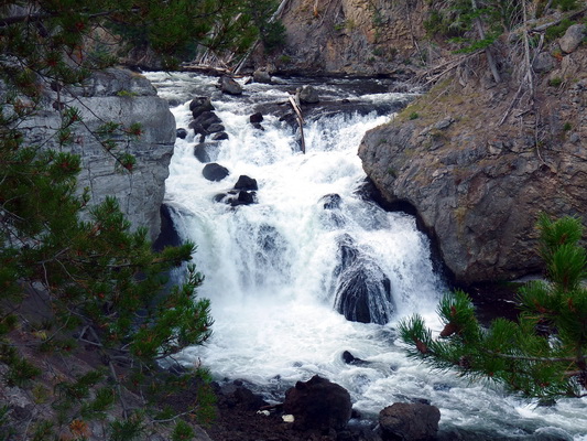 Wir steuern als Erstes den Firehole Canyon Drive ab. Früh am Morgen ist es noch ziemlich frisch und wir frieren doch tatsächlich mal beim ersten Stop. Den Firehole Falls: