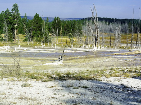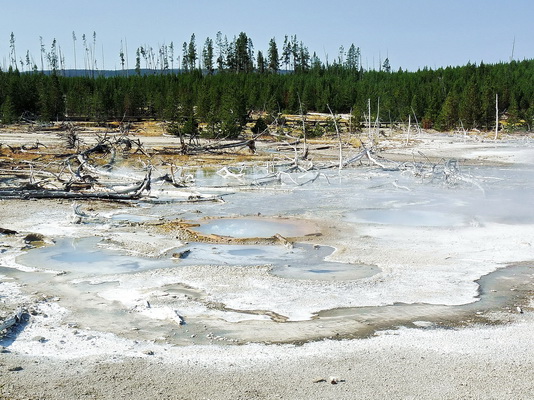 Auch eine schöne Strasse durch herrliche Landschaft mit vielen Geysiren und Skleinen Pools und Seen. Immer wieder faszinierend die weissen abgestorbenen Bäume: