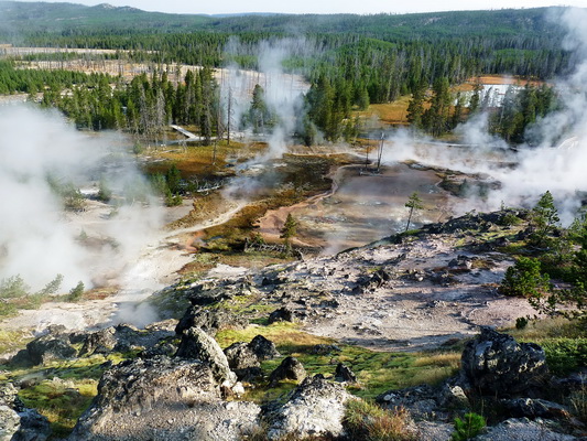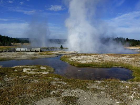 Dann kommen wir zum Firehole Lake. Hier dampft und sprudelt es auch aus allen Löchern. Zu der frühen Zeit aber sehr viel Dampf. Trotzdem erkunden wir auf dem Boardwalk die Szenerie.