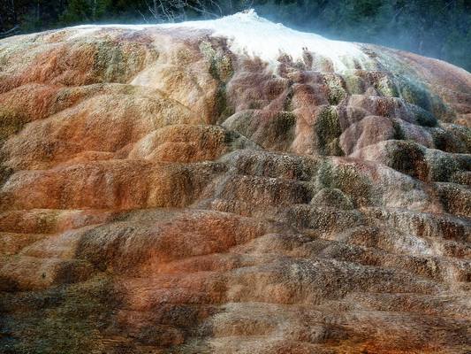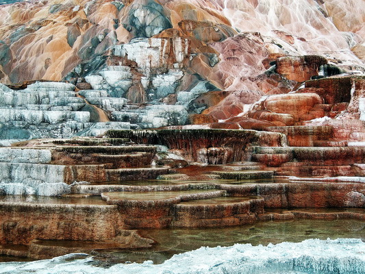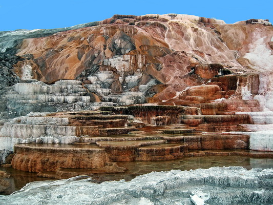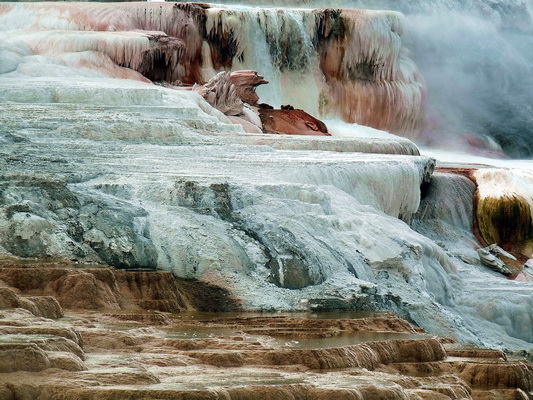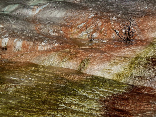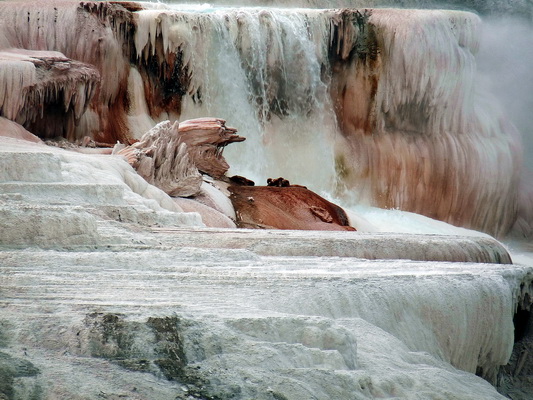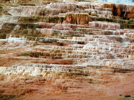 Angekommen bei den Mammoth Hot Springs halten wir an einem Parkplatz der Lower terrace. Dort gibt es die Palette Springs. Für mich ein Kunstwerk. Und wir sind mal wieder vollauf begeistert.