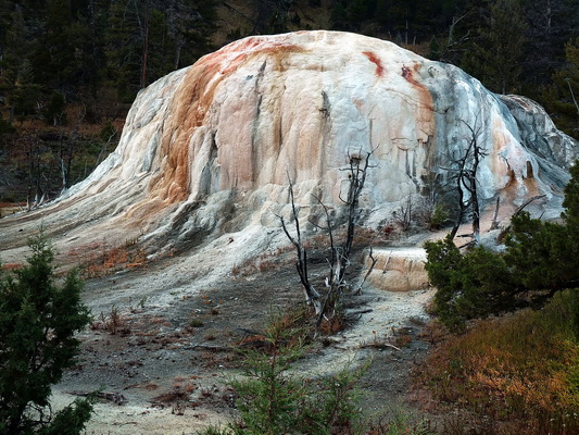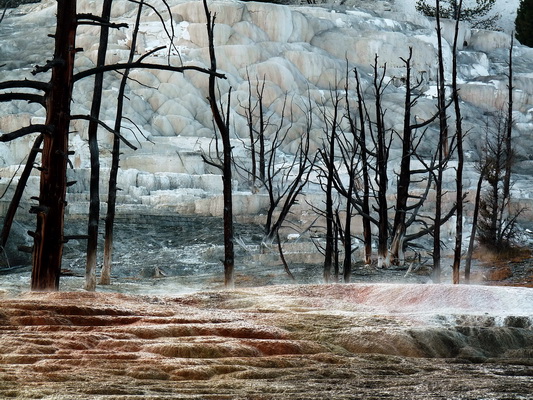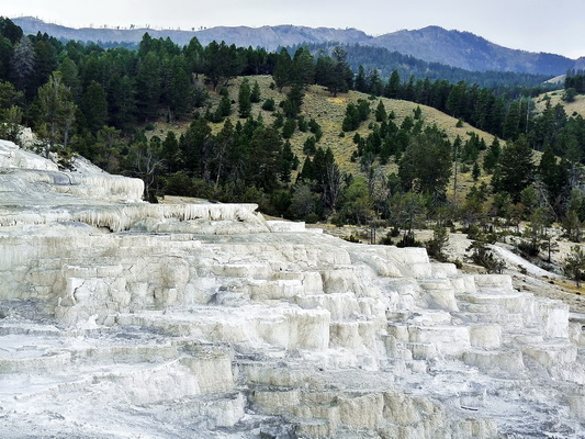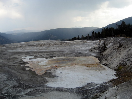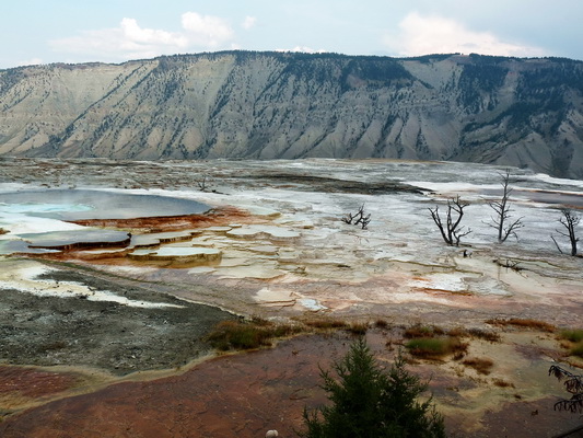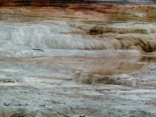 Plötzlich verschwindet die Sonne hinter den Wolken und es wird dunkler. Dennoch  wollen wir hochlaufen per Boardwalk zu den Upper Terrace. Die Upper Terrace kann man auch mit dem Auto erreichen. Aber wir wollen ja laufen und sehen die Main Terrace. Leider auch ausgetrocknet, aber ganz netter Anblick: