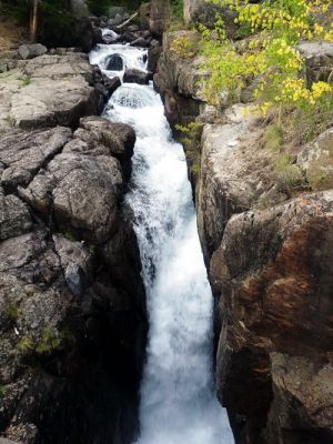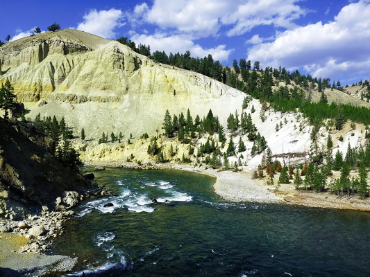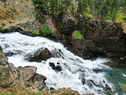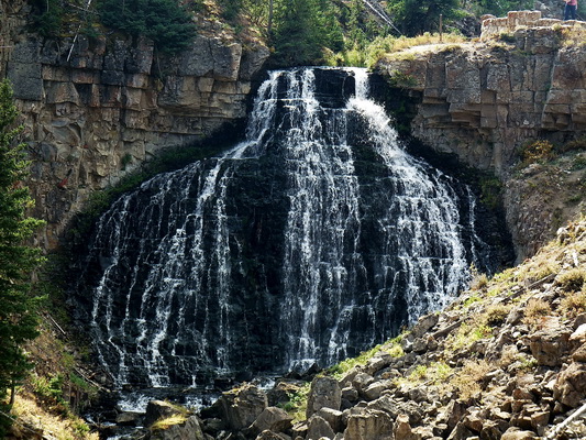 Es geht jetzt wieder Richtung Mammoth Hot Springs und wir halten vorher an der Golden Bridge. Bei einem Turnout kann man die Rustic Falls begutachten: