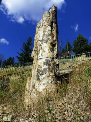 Ja, dann gehts weiter hinter Mammoth Richtung Norden. Kurz vor der Tower Roosevelt Kreuzung machen wir den Abstecher zum Petrified Tree. Ein versteinerter Baum. Man könnte auch Gefängnisbaum sagen, da er mit Gitterstäben eingezäumt ist.