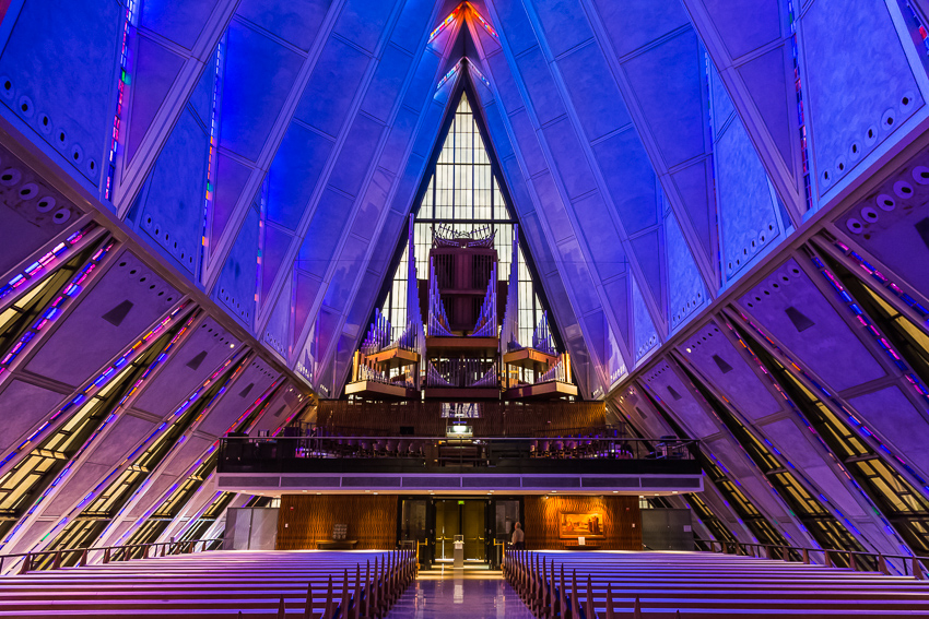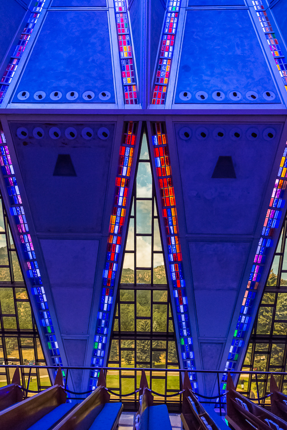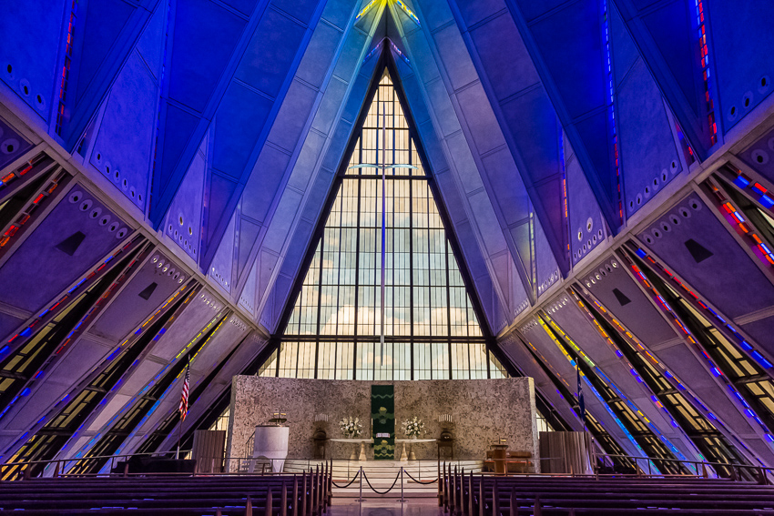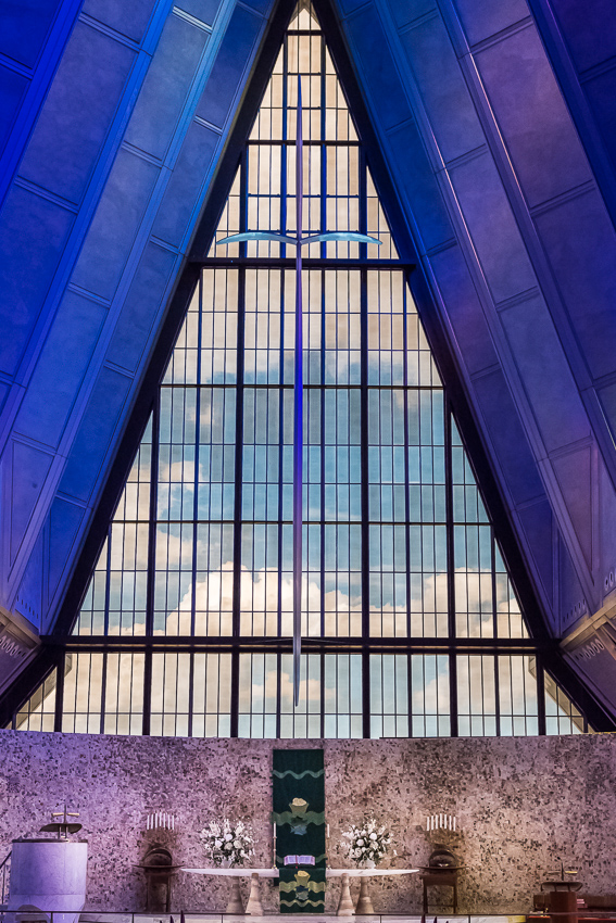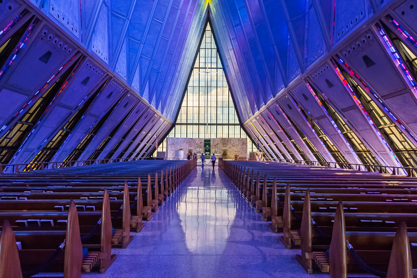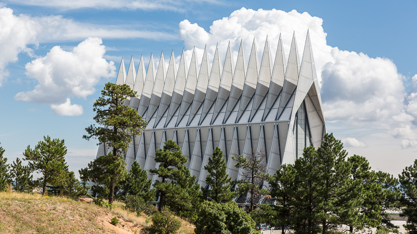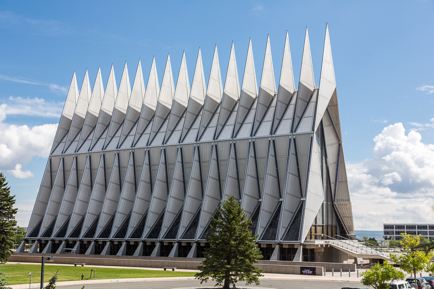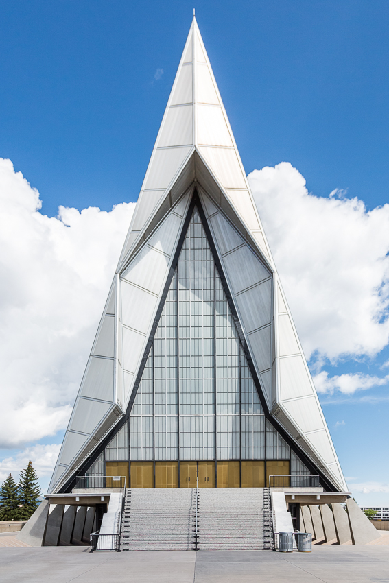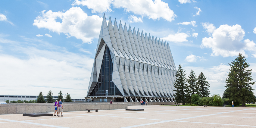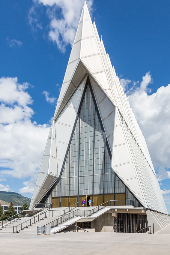 Zuerst fuhren wir den zweiten Aussichtspunkt an, von hier aus hatte man einen guten Ausblick über einen Teil des riesigen Geländes. Da Tom noch gar nichts gefrühstückt hatte und Paul auch schon wieder Hunger hatte, wurde kurz der Generator angeschmissen und ein paar Bagels getoastet. Nachdem alle satt waren, fuhren wir ins "Visitor Center" der Anlage. Dort wurde ein 21 minütiger, interessanter Film über das erste Jahr der Kadetten gezeigt. Danach liefen wir den kurzen Weg bis zum eigentlichen Ziel, der von 1959 - 1962 erbauten „United States Air Force Academy Cadet Chapel“. Ein zur damaligen Zeit sehr umstrittenes Bauwerk, heute wohl architektonisch eine der modernsten Kirchen die zumindest ich bisher gesehen habe.