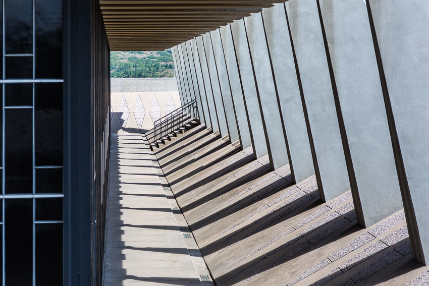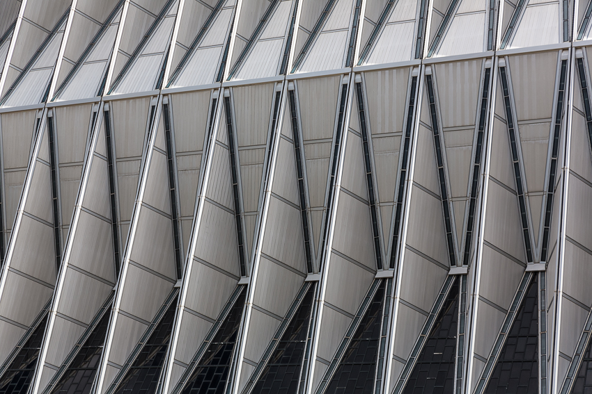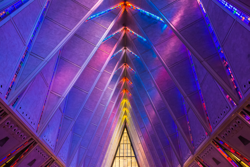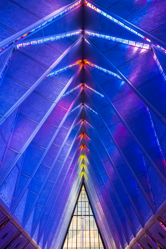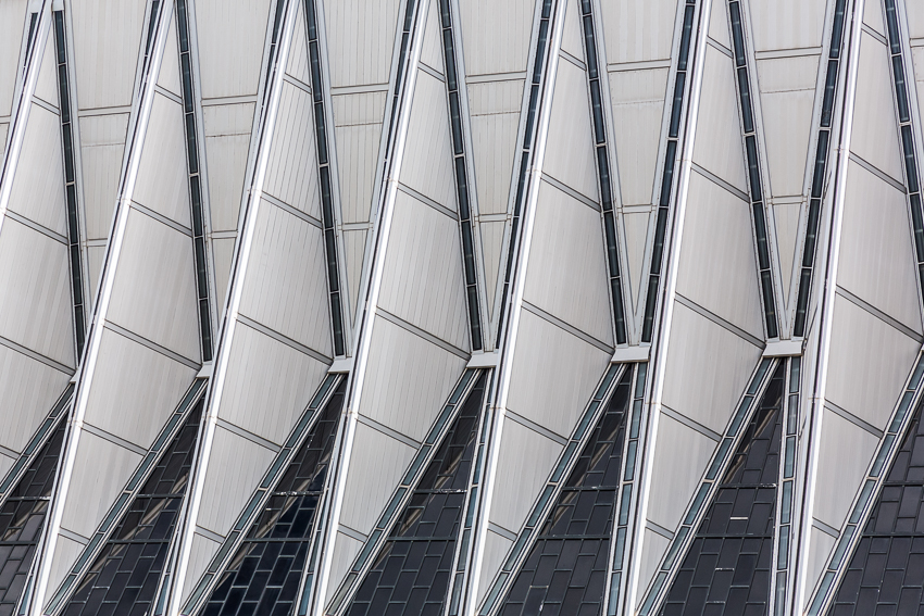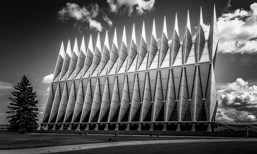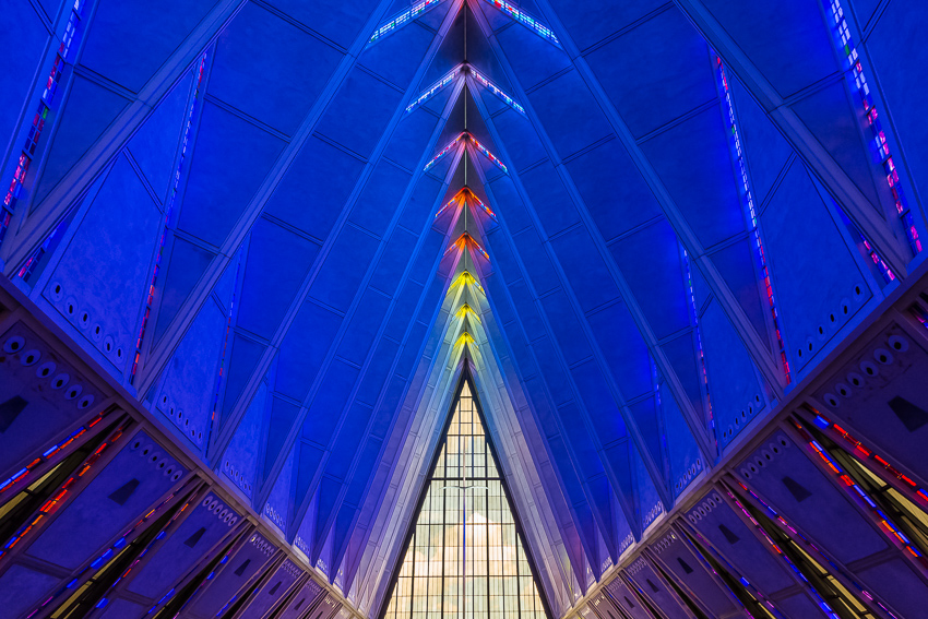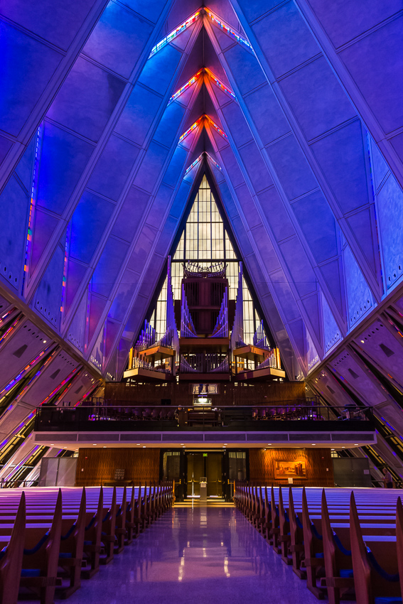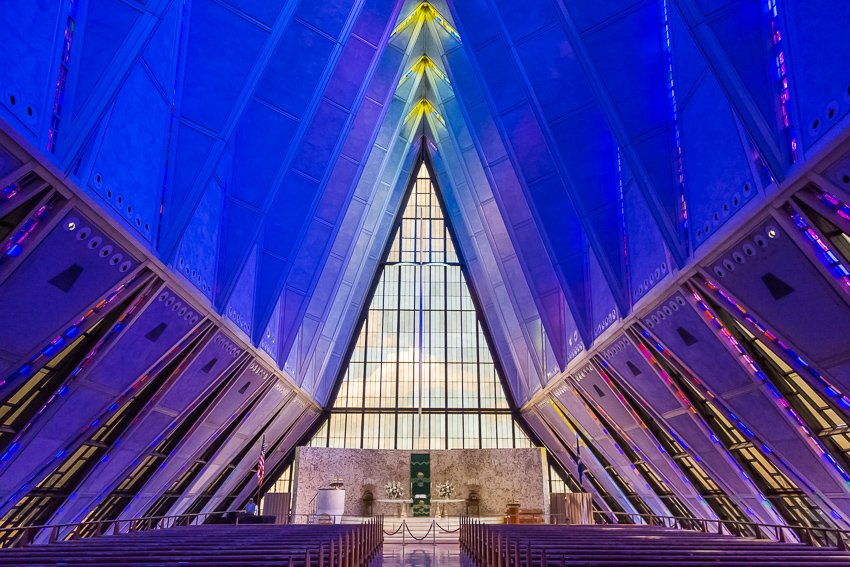 Zuerst fuhren wir den zweiten Aussichtspunkt an, von hier aus hatte man einen guten Ausblick über einen Teil des riesigen Geländes. Da Tom noch gar nichts gefrühstückt hatte und Paul auch schon wieder Hunger hatte, wurde kurz der Generator angeschmissen und ein paar Bagels getoastet. Nachdem alle satt waren, fuhren wir ins "Visitor Center" der Anlage. Dort wurde ein 21 minütiger, interessanter Film über das erste Jahr der Kadetten gezeigt. Danach liefen wir den kurzen Weg bis zum eigentlichen Ziel, der von 1959 - 1962 erbauten „United States Air Force Academy Cadet Chapel“. Ein zur damaligen Zeit sehr umstrittenes Bauwerk, heute wohl architektonisch eine der modernsten Kirchen die zumindest ich bisher gesehen habe.