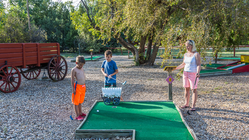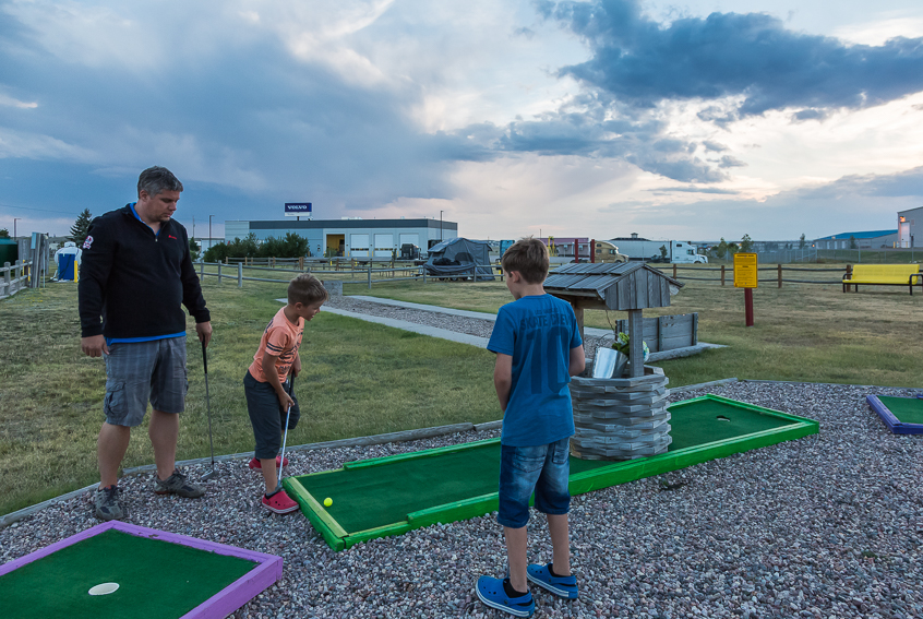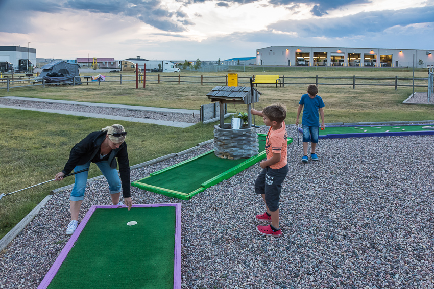 Um viertel vor vier kamen wir dann am schön gelegenen KOA vor den Toren des Badland Nationalparks an. In Windeseile stöpselten Tom und Paul das Wohnmobil an, dann ging es gemeinsam zum Pool. Einziges Problem: der war so richtig ars…kalt. Tom und Paul, die sich so richtig darauf gefreut hatten, hielten es keine 5 Minuten im Wasser aus. Dann kamen sie zähneklappernd und mit Gänsehaut aus dem Wasser. Birgit und ich haben uns die Füsse dann gar nicht erst naß gemacht, wenn die Jungs das Wasser schon für zu kalt befanden dann geht bei uns gleich gar nix mehr. Wir gingen also wieder zurück zum Wohnmobil, Birgit und ich planten die nächsten Tage, Tom und Paul erkundeten währenddessen etwas den Campingplatz. Als Sie zurückkamen, erzählten sie uns begeistert von dem Minigolfplatz. Wir zogen uns schnell um, holten für in Summe 10$ Minigolfschläger und Bälle, und spielten die insgesamt 9 Bahnen.