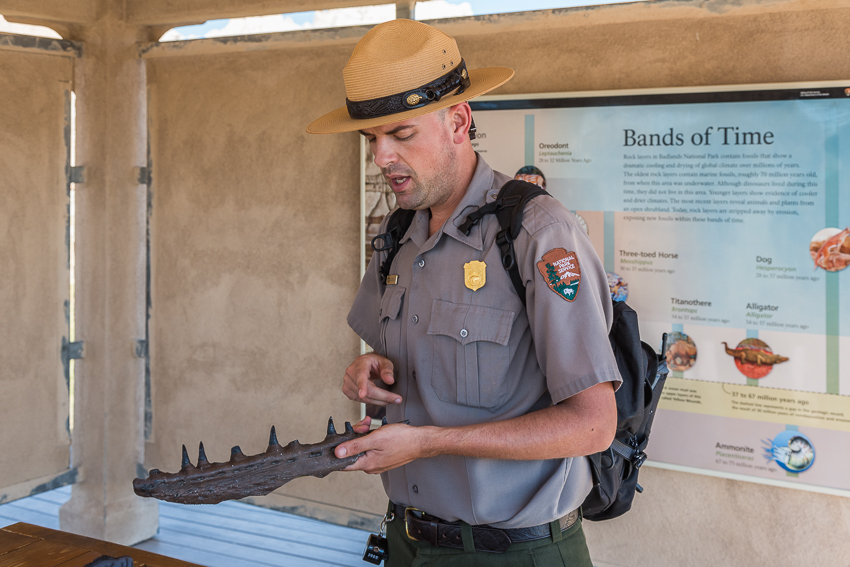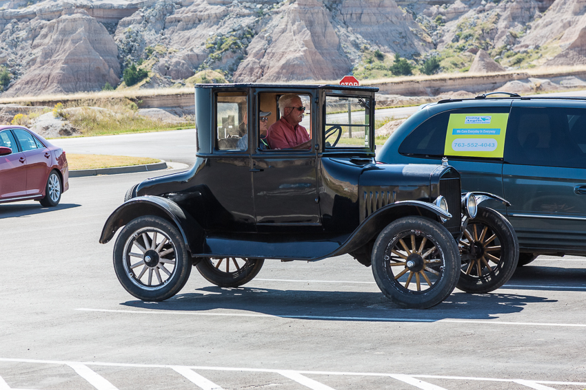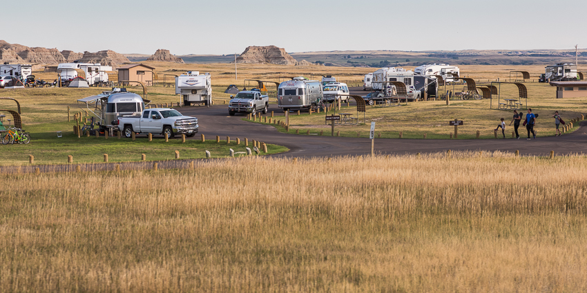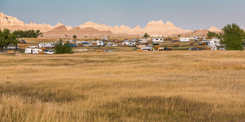 Das erste Mal wurden wir gegen kurz nach 08.00 wach, in der nächsten halben Stunde fuhren gefühlte 200 Wohnmobile oder Trailer an uns vorbei. Irgendwie bekam ich so langsam ein schlechtes Gewissen. Um 09.00 quälten dann auch wir uns langsam aus dem Bett, schlimm genug das es schon so spät war und es macht ja auch keinen Sinn den Urlaub komplett zu verschlafen. Nach dem Frühstück und einer „Schnelldusche“ von Tom fuhren wir wieder die 4 Meilen in den benachbarten "Badlands Nationalpark" - heute sollten es nur schlappe 94° Fahrenheit werden (35° Celsius).