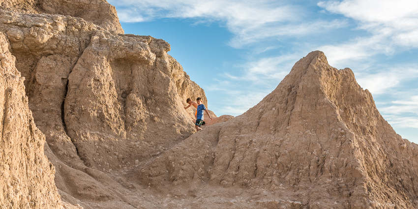 Nach 20 Minuten waren wir dann auch schon durch - es gab weder Sieger noch Verlierer, da Tom und Paul jeweils 30 Schläge, Birgit und ich jeweils 21 Schläge für den Kurs benötigten. Nachdem Paul die Schläger wieder ins KOA- Office zurückgebracht hatte, entschlossen wir uns zum Sonnenuntergang in die nur 4 Meilen entfernten Badlands zu fahren. Nach einem Besuch im Ben Reifel Visitorcenter (hatte bis 19.00 offen) fuhren wir ein paar Meilen in den Park und klapperten 3 Aussichtspunkte ab. Tom und Paul hatten beim Klettern viel Spaß, allerdings konnte einem bei der Turnerei auch schon mal Angst und Bange werden. Gegen 19.00 machten wir dann irgendwo in der Nähe vom „Fossil Exhibit Trail“ Halt, um uns den Sonnenuntergang anzuschauen.