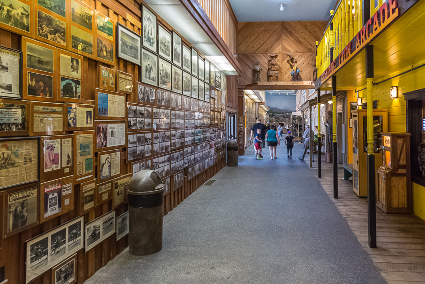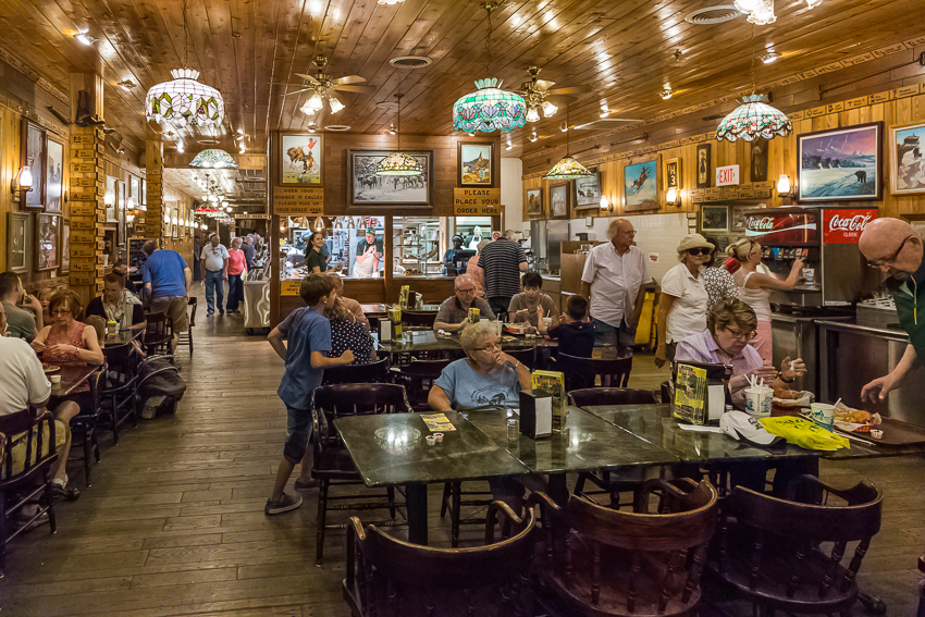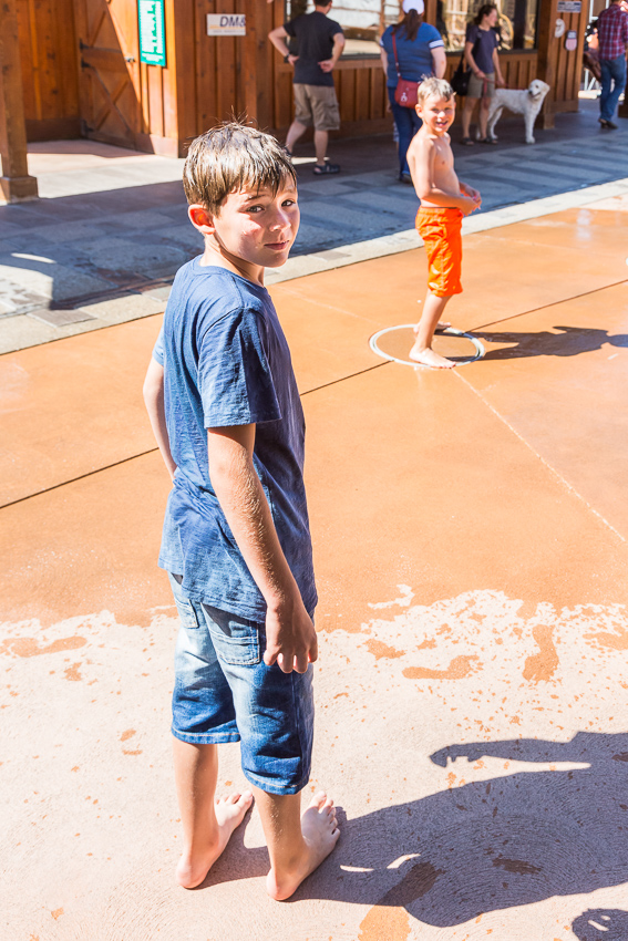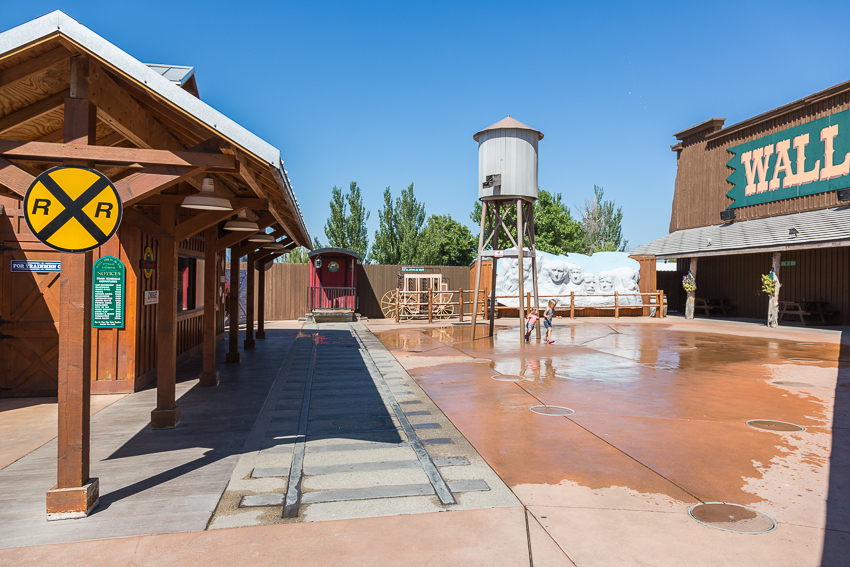Um kurz nach 12.00 verliessen wir dann den Nationalpark, 8 Meilen später legten wir dann in „Wall“ den nächsten Halt ein. Hier in „Wall“ gibt es mit dem „Hustead's" Drug Store den kuriosesten „Ramschladen“ in den USA. Wir gruschten durch die einzelnen Läden, Paul kaufte sich von seinem eigenen Geld in einem "Stone Shop" einen schönen Kristall und dann gab es im „Wall Drug Store Café" für alle einen leckeren Bacon Cheeseburger mit Fries. Nachdem alle satt waren, hatten die Jungs noch im Backyard des Drugstores eine ganze Zeit lang Spaß an einem großen Wasserspiel. Paul hatte seine Badehose eh schon an, Tom war nach kürzester Zeit nass bis auf die Unterhose.