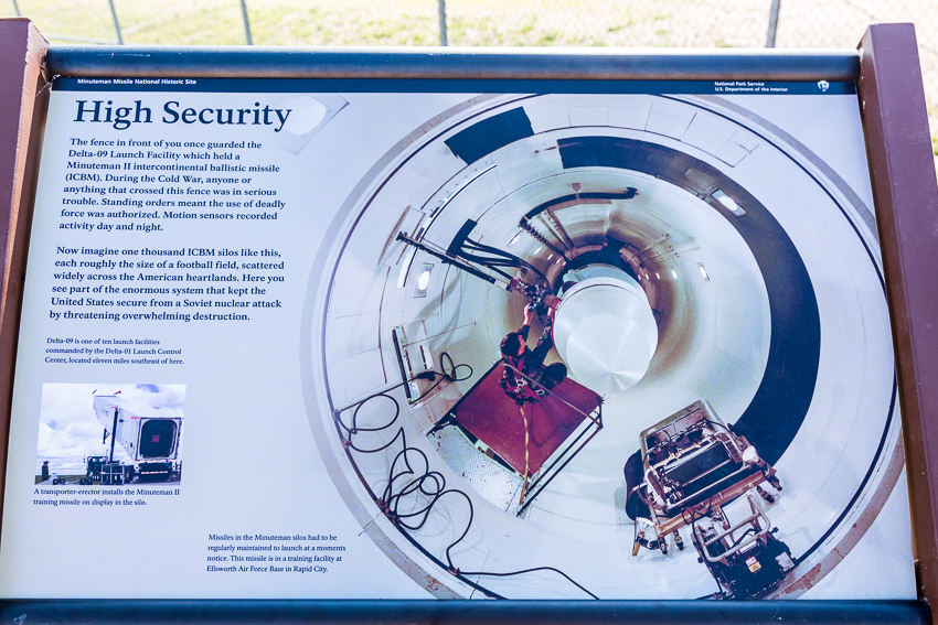 Gegen 15.00 fuhren wir dann weiter, nicht ohne vorher noch in „Wall“ für 2,39$/ Gallone unseren Schluckspecht vollzutanken. Dann ging es für ein paar Meilen auf die I90 South. Am Exit 116 fuhren wir raus und wollten uns eine der ehemaligen Abschussrampen für die atomaren Minuteman II Raketen anzuschauen. Laut Grundmann Reiseführer geöffnet bis 16.30, laut Vorhängeschloss und Hinweistafel bis 15.30. Wir standen übrigens um kurz nach 15.30 am Zaun der Abschussrampe. Leicht enttäuscht fuhren wir nun weiter Richtung Mount Rushmore. Laut Navi eine Strecke von rund 1,5 Stunden. Unterwegs machte wir noch einen Ministopp an einem Walmart Supercenter. Wir kauften noch 32 Flaschen Wasser, die nun hoffentlich bis zum Ende des Urlaubs reichen sollten.