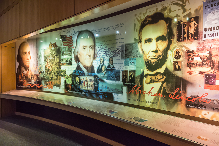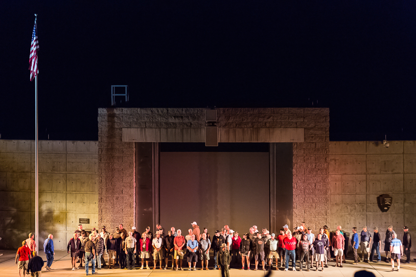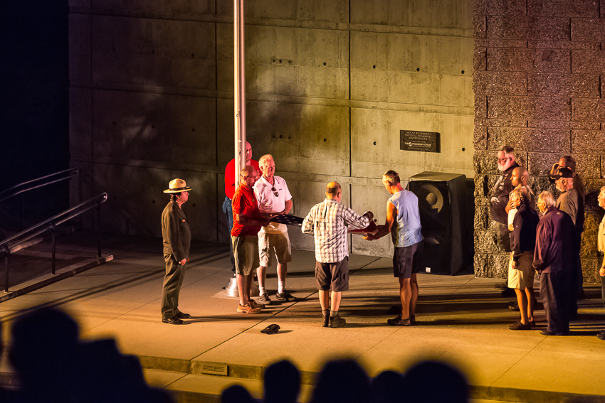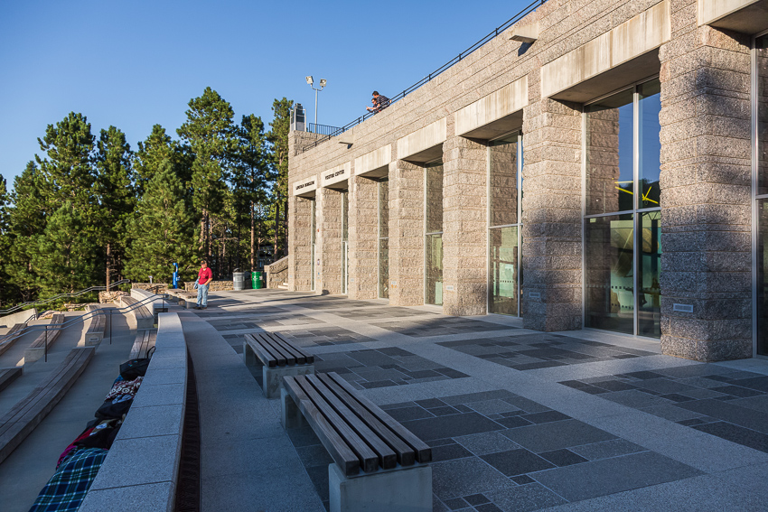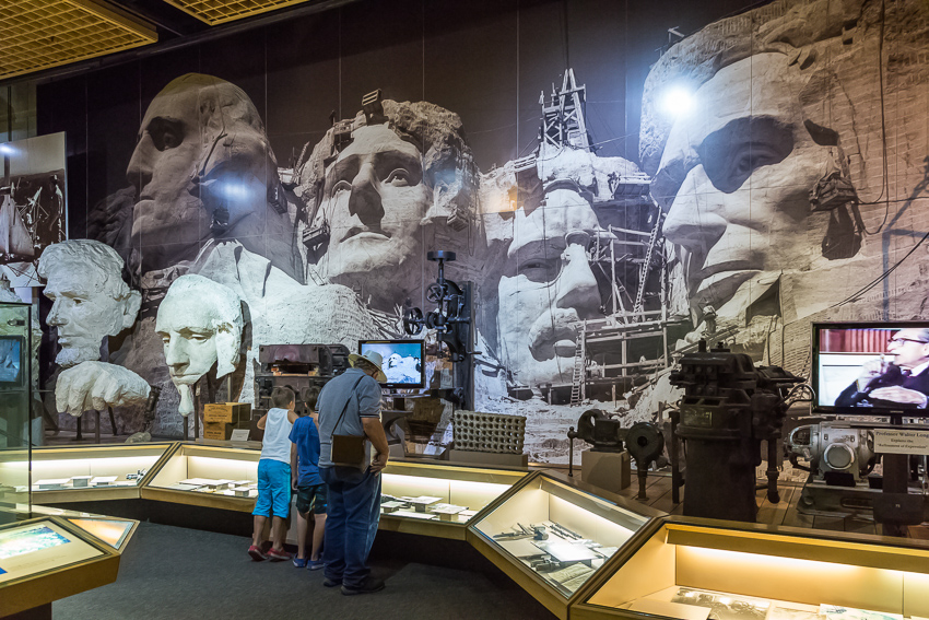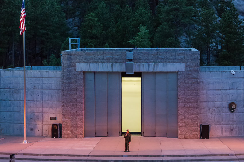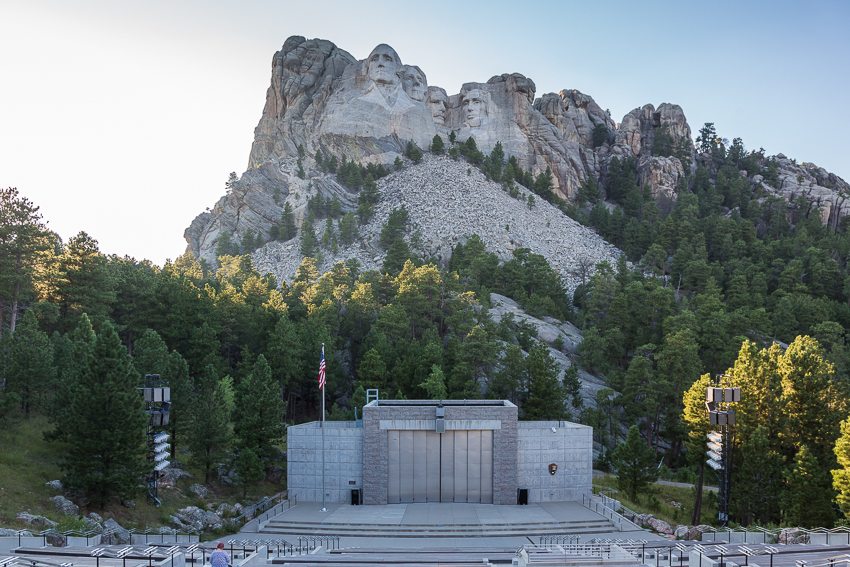 Um 18.00 erreichten wir dann Mount Rushmore, zahlten brav die 11$ Parkgebühren und liefen die „Avenue of  the Flags“ entlang bis zum „Mt. Rushmore Amphitheater“. Von hier aus hatte man den besten Blick auf die 4 Steinköpfe. Von links nach rechts in Stein gemeiselt waren „George Washington“, „Thomas Jefferson“, Theodore Roosevelt“ und „Abraham Lincoln“ zu sehen, ein wirklich beeindruckendes Bau,- und Kunstwerk. Mit einer kleinen Ausstellung über die Bauarbeiten des Meisterwerkes, einem Film und etwas Warten verbrachten wir die Zeit bis zu Beginn der „Evening Lighting Ceremony" um 20.00. Zuerst erklärte der Ranger einiges über die 4 Präsidenten und die ganzen Nationalparks/ Nationalmonumente in den USA. Ich muss zugeben, das war für die Kids dann doch etwas langweilig. Birgit und ich konnten nicht ständig „simultan“ übersetzen, und so hatten Tom und Paul relativ wenig davon. Auch der anschliessende - gut gemachte - Film über die Geschichte der USA und ihrer 4 historischen Präsidenten war dementsprechend nicht das Wahre für Tom und Paul. Erst als dann die 4 Steinköpfe beleuchtet wurden und ein ganzer Haufen Militärangehöriger auf die Bühne kam (damit ein paar von ihnen die Flagge einholen konnten) wurde es wieder interessanter für die beiden.