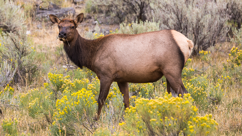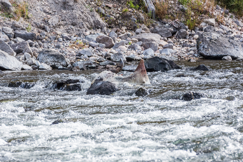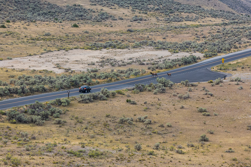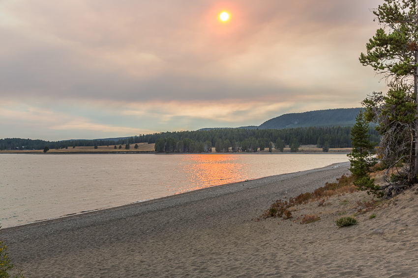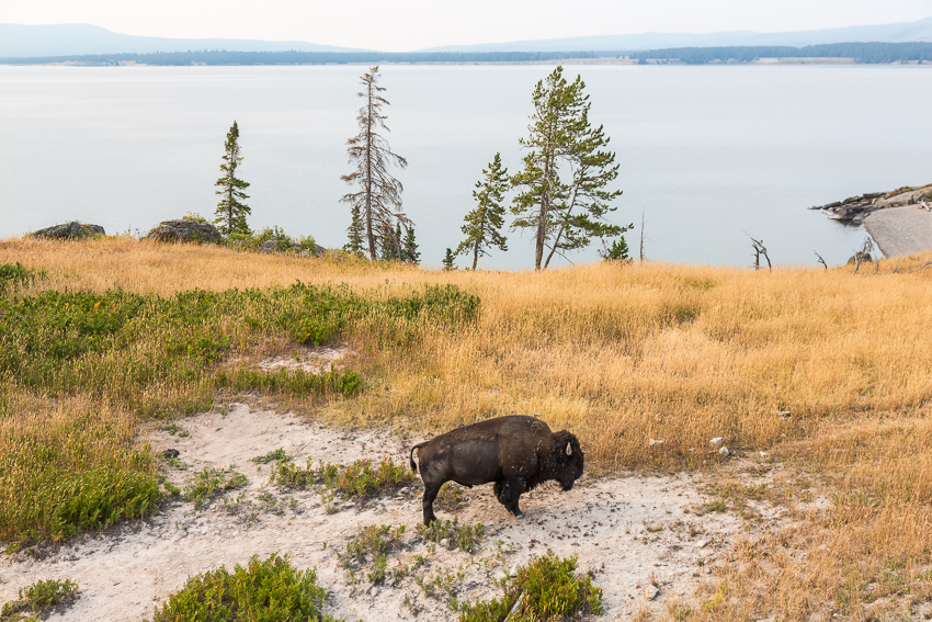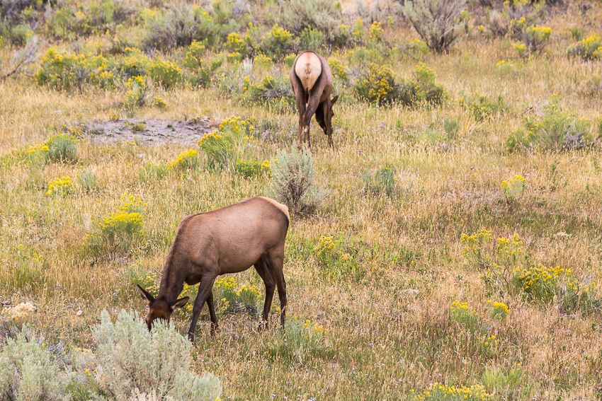 Mittlerweile war es 19.00 geworden und wir fuhren zum gegenüberliegenden gleichnamigen Campground. Laut Grundmann Reiseführer nicht unbedingt der Knaller, aber für die erste Nacht hatte er eine gute Lage. Beim „Einchecken“ empfahl uns die supernette Lady für die nächsten Tage den Mammoth Hot Springs Campground im Norden des Parks. Alle Campgrounds im nördlichen Teil des Parks sind „First come, First serve“ Plätze. Und der Mammoth Hot Spring Campground war die letzten Tage über wohl immer erst gegen 20.00 voll. Der Fishing Bridge Campground ist übrigens ein „Hard-sided camping units only“ Platz, da es hier wohl vor Bären wimmelt. Und da ist eine Nacht im Zelt wohl nicht so das Prickelnde. Bären hatten wir übrigens zwar leider keinen gesehen, aber dafür einen Fuchs und mehrere süße Streifenhörnchen. Ansonsten ließ sich die Tierausbeute für die ersten Stunden im Park schon mal sehen.