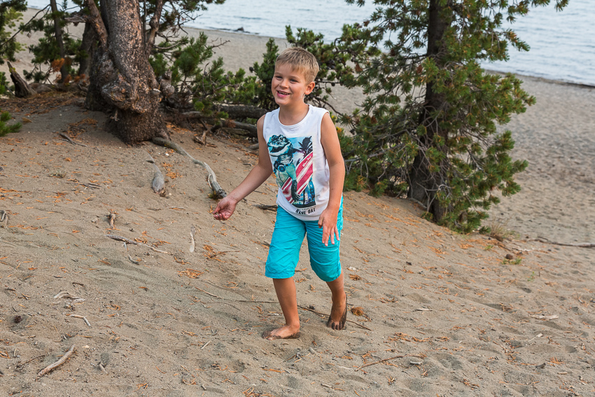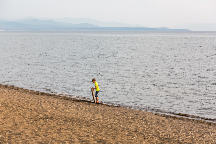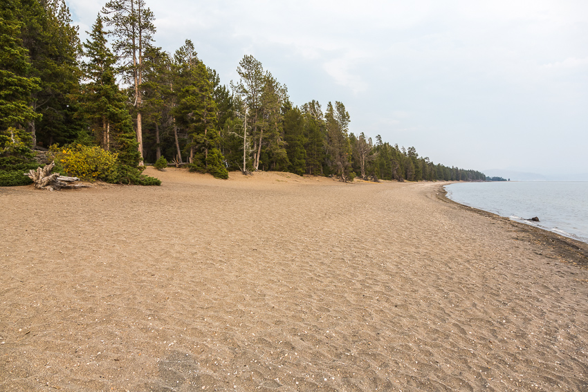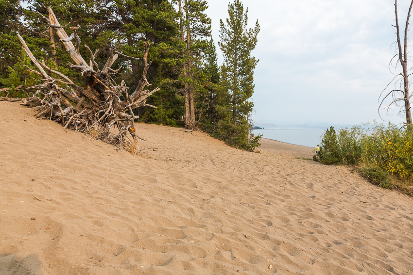 Kurz vor dem östlichen Parkeingang, in der Nähe von Pahaska, dann unser erster Büffel - Juchhu !!! Direkt am Straßenrand, keine 5 Meter von meinem Fenster entfernt. Schon waren die ersten fünf Fotos im Kasten und ließen schlimmeres für die nächsten Tage befürchten. Es dauerte keine 10 Minuten, standen am Straßenrand schon wieder 2 Rehe - nicht das wir gestern Nacht schon das eine oder andere gesehen hatten :.-). Am Yellowstone- Lake sahen wir dann die ersten dampfenden Erdlöcher, die zum Teil tief dröhnende Geräusche von sich gaben. So ging es unentwegt weiter, bis wir am Fishing Bridge Visitor Center ankamen. Die Kinder hatten am dortigen schönen Sandstrand ihren Spaß und bauten für die vielen vorhandenen Marienkäfer eine Schutzburg vor den ebenfalls vorhandenen Ameisen.