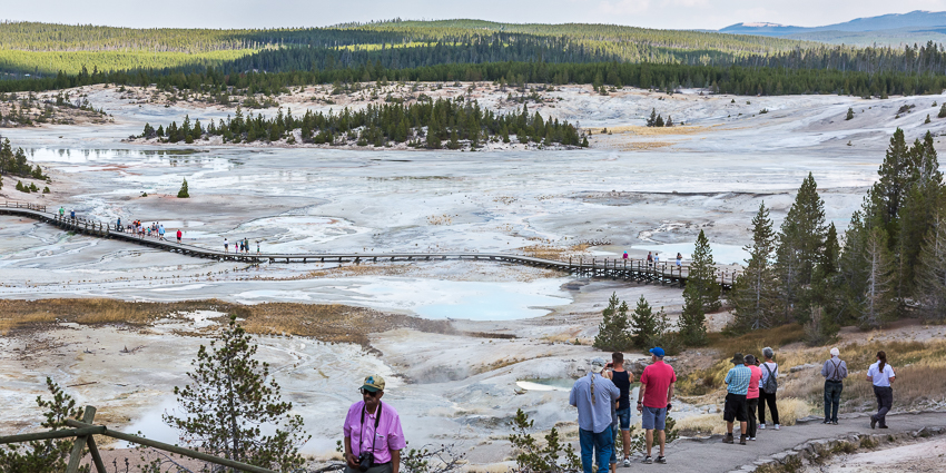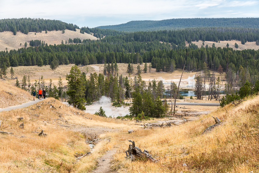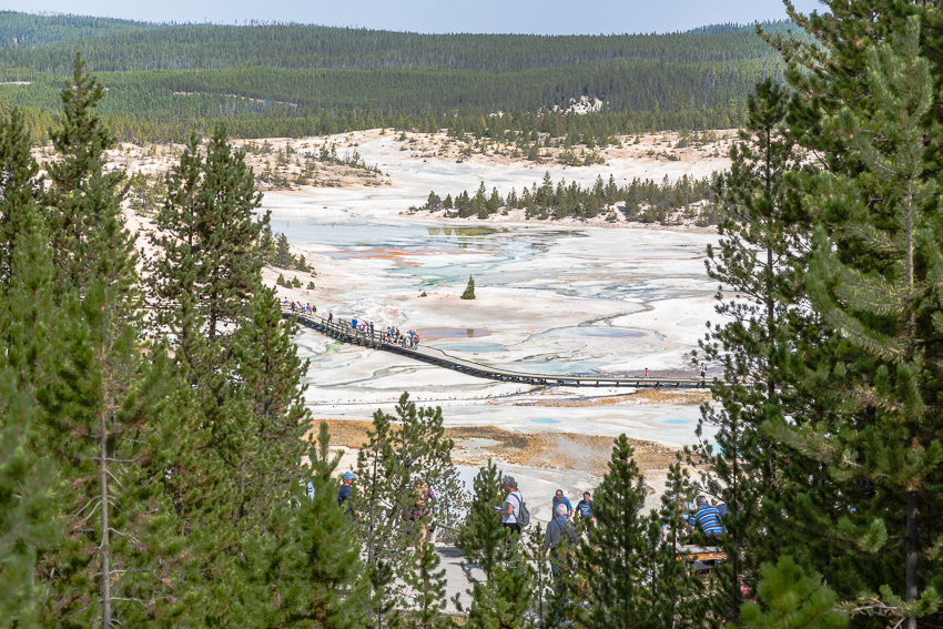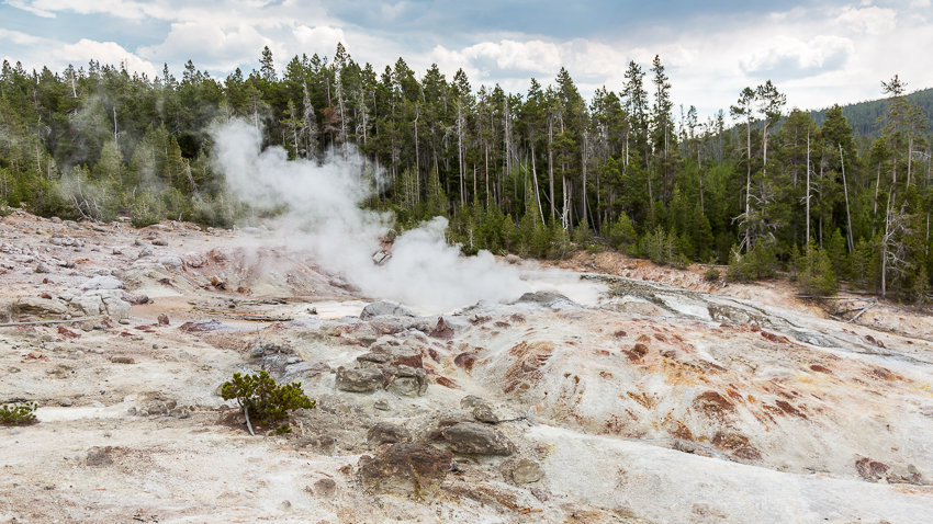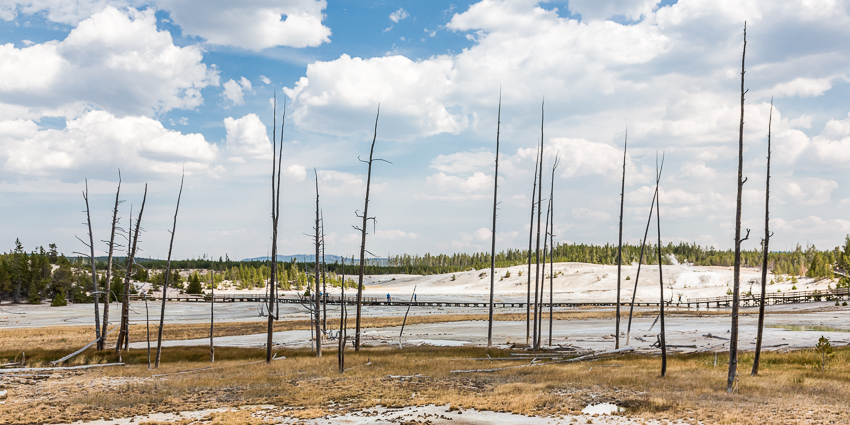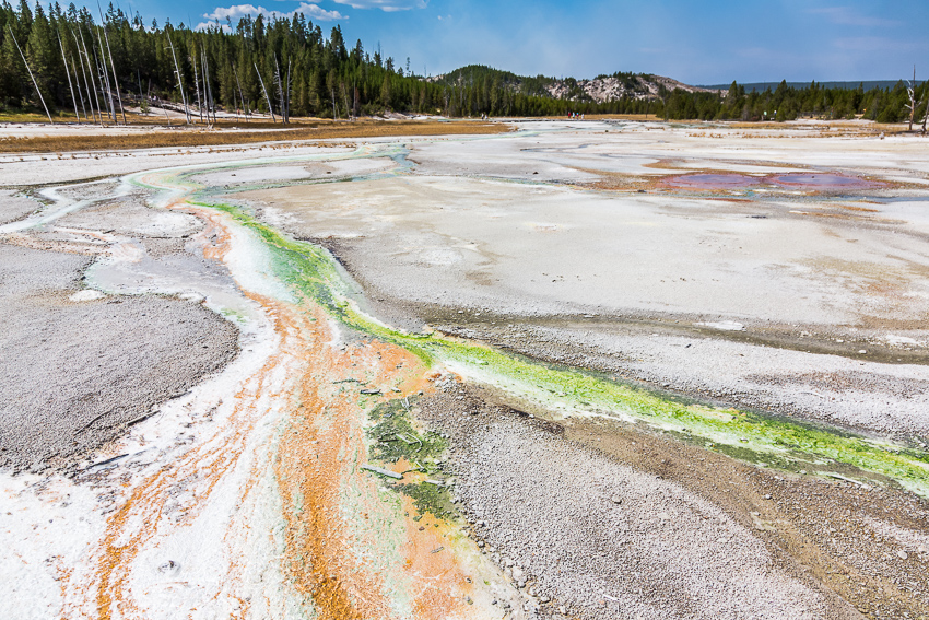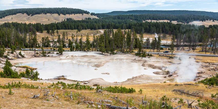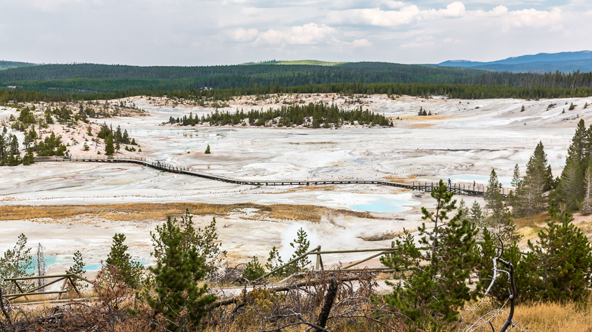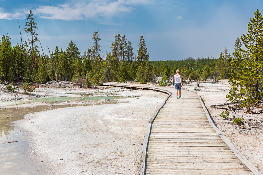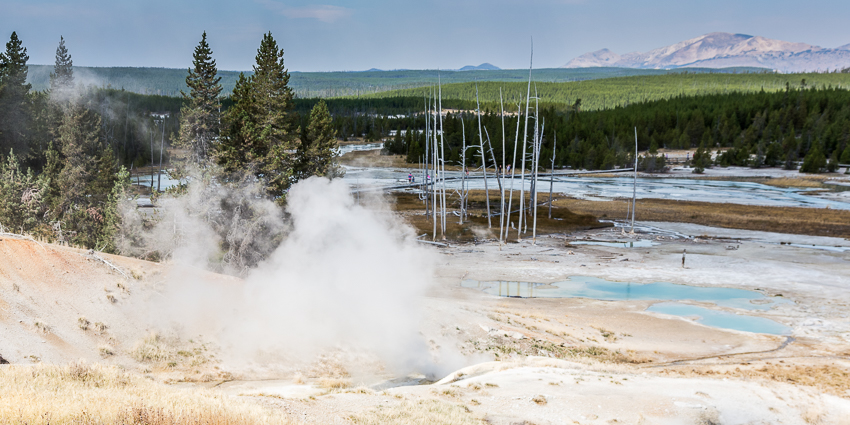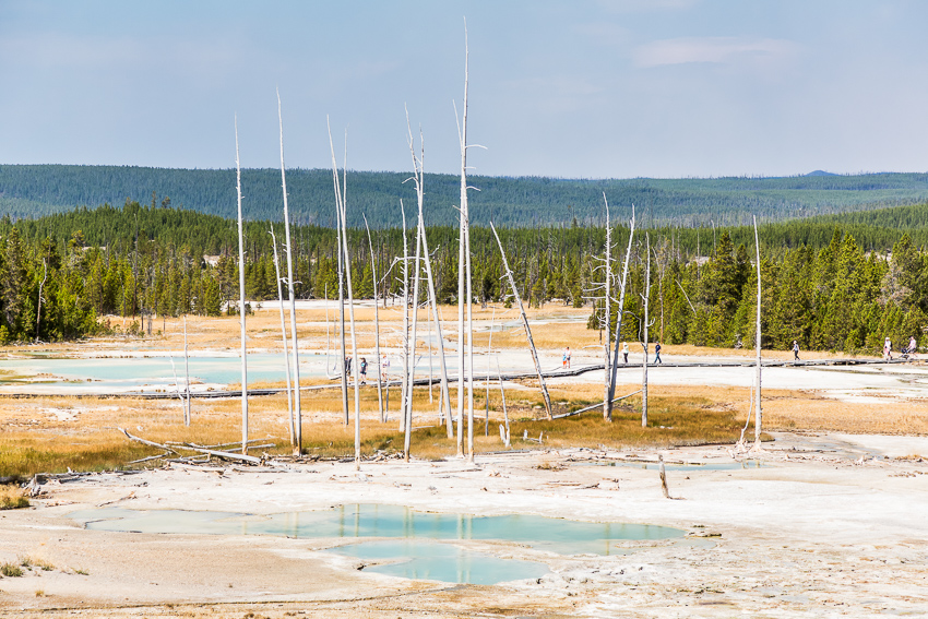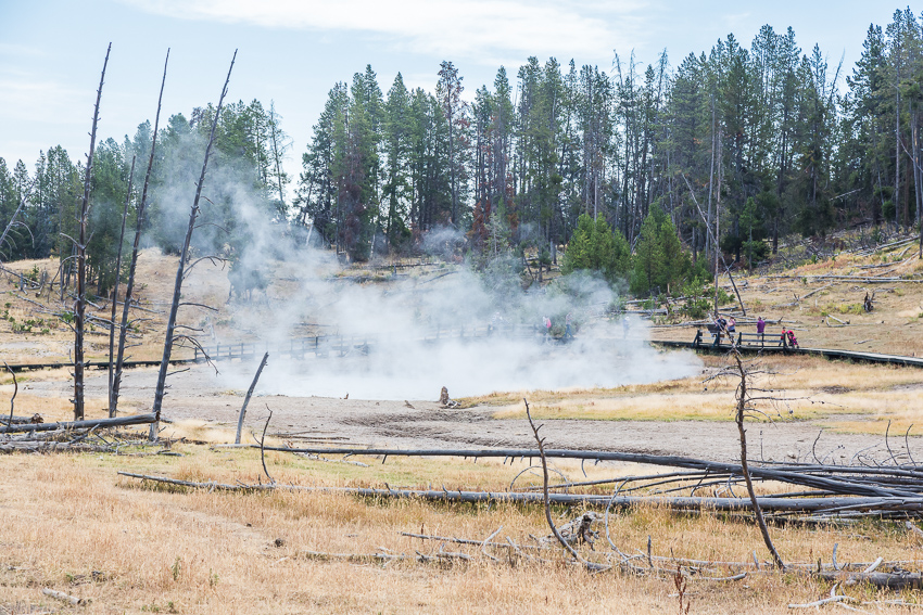 Von Mammoth Hot Spring aus ging es dann weiter über den Roaring Mountain bis zum Norris Geyser Basin. Dort liefen wir die beiden Trails „Back Basin“ und „Porcelain Basin“. Die Sonne schien phasenweise doch recht stark und so wurde uns im Laufe des Trails (in Summe waren beide irgendwas um die 5Km lang) ganz schön warm. Zum Glück hatten wir zwei Wasserflaschen dabei und so musste zumindest niemand verdursten. Nach etwas über 2 Stunden fuhren wir dann weiter Richtung Madison. Unterwegs machten wir immer wieder Halt an einzelnen Trails oder Photostops.