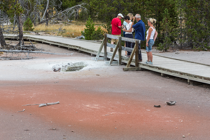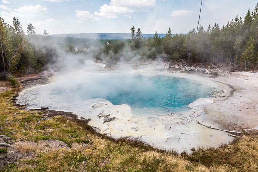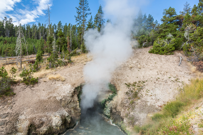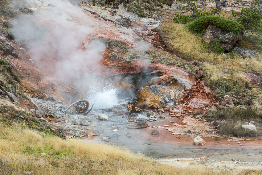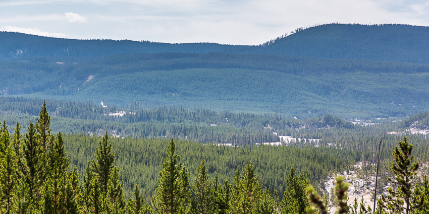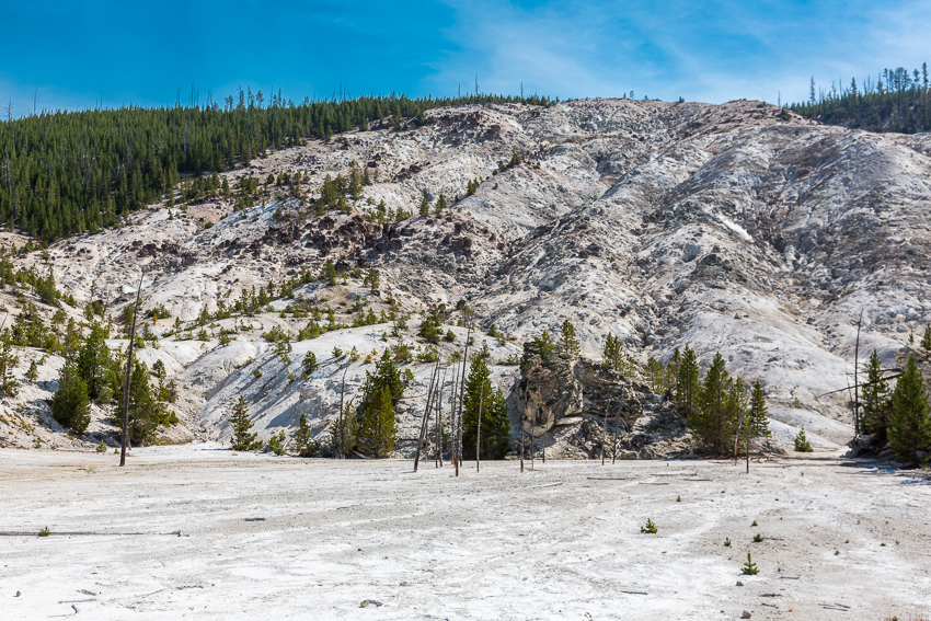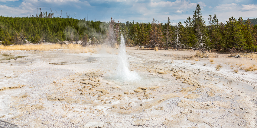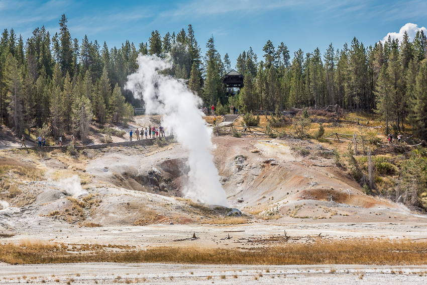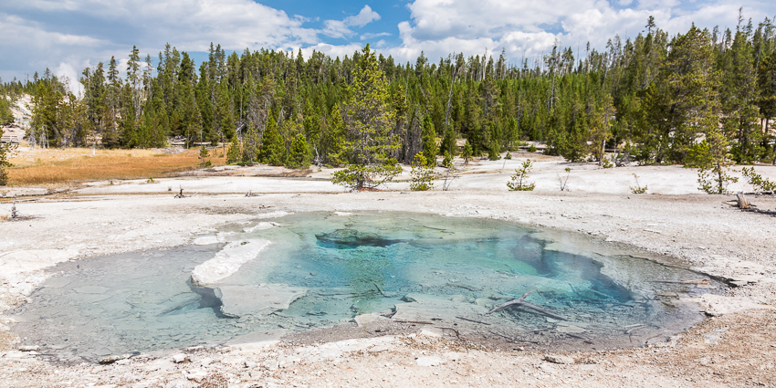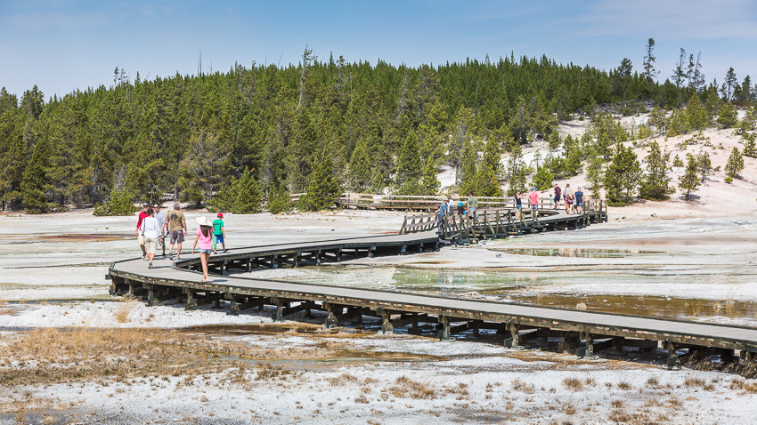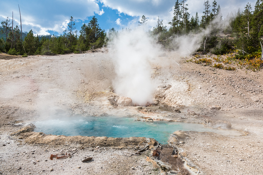 Von Mammoth Hot Spring aus ging es dann weiter über den Roaring Mountain bis zum Norris Geyser Basin. Dort liefen wir die beiden Trails „Back Basin“ und „Porcelain Basin“. Die Sonne schien phasenweise doch recht stark und so wurde uns im Laufe des Trails (in Summe waren beide irgendwas um die 5Km lang) ganz schön warm. Zum Glück hatten wir zwei Wasserflaschen dabei und so musste zumindest niemand verdursten. Nach etwas über 2 Stunden fuhren wir dann weiter Richtung Madison. Unterwegs machten wir immer wieder Halt an einzelnen Trails oder Photostops.